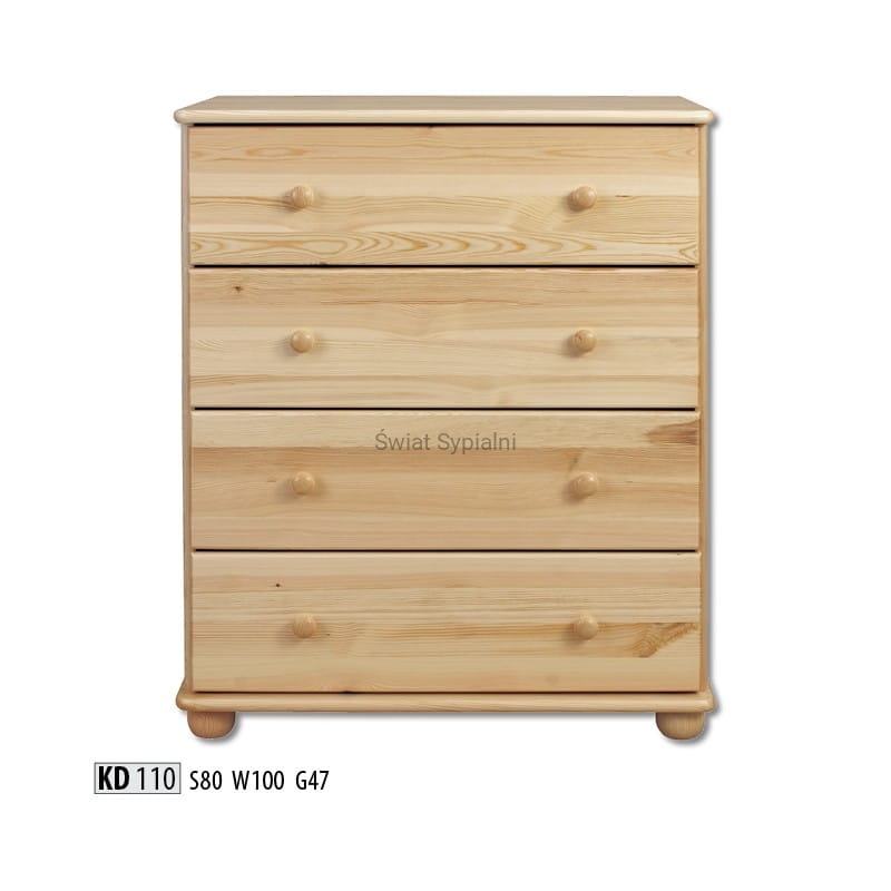 Sosnowa komoda KD110 rozkocha w sobie miłośników klasycznych i ponadczasowych wnętrz. Jej minimalistyczny design sprawia, że wpasuje się w niemal każdą aranżację wnętrz. Wyraźnie widoczne usłojenie naturalnego drewna z którego powstała dodaje jej uroku, oraz ociepla pomieszczenie, w którym zostanie wyeksponowana. Dzięki komodzie KD110 stworzysz piękne, niezwykle przytulne ale i funkcjonalne wnętrze. Wyposażona w lekko otwierane i pojemne szuflady, które pomieszczą domowe przedmioty. Duży blat mebla posłuży do eksponowania rodzinnych pamiątek lub zdjęć.