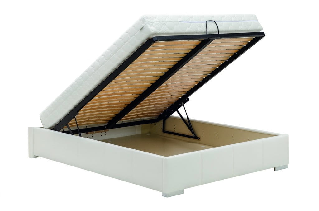Łóżko tapicerowane z funkcjonalnym pojemnikiem na pościel, który znajduje się pod stelażem i materacem na całej wielkości łóżka. Stelaż na metalowej ramie z poprzecznymi elastycznymi listewkami jest otwierany z użyciem dwóch siłowników gazowych. Dno łóżka, płyta z okrągłymi wywietrznikami daje dodatkową cyrkulację powietrza w pojemniku gdyż jest mocowana na kątownikach w odpowiedniej wysokości od podłogi.