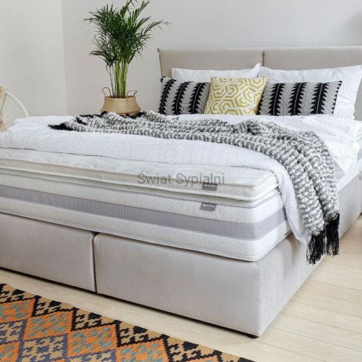 Baza kontynentalna – wyposażona we wkład sprężynowy, który sam w sobie zapewnia już pewien poziom komfortu. Do bazy dobierz wezgłowie następnie materac główny oraz materac nawierzchniowy. Dzięki współpracy wszystkich trzech warstw łóżko kontynentalne gwarantuje największy komfort odpoczynku. Decydując się na nie, możesz także skorzystać z opcji tapicerowania boków materaca, wybierając z czterech różnorodnych modeli. Baza w komplecie z plastikowymi nóżkami o wys. 3 cm.