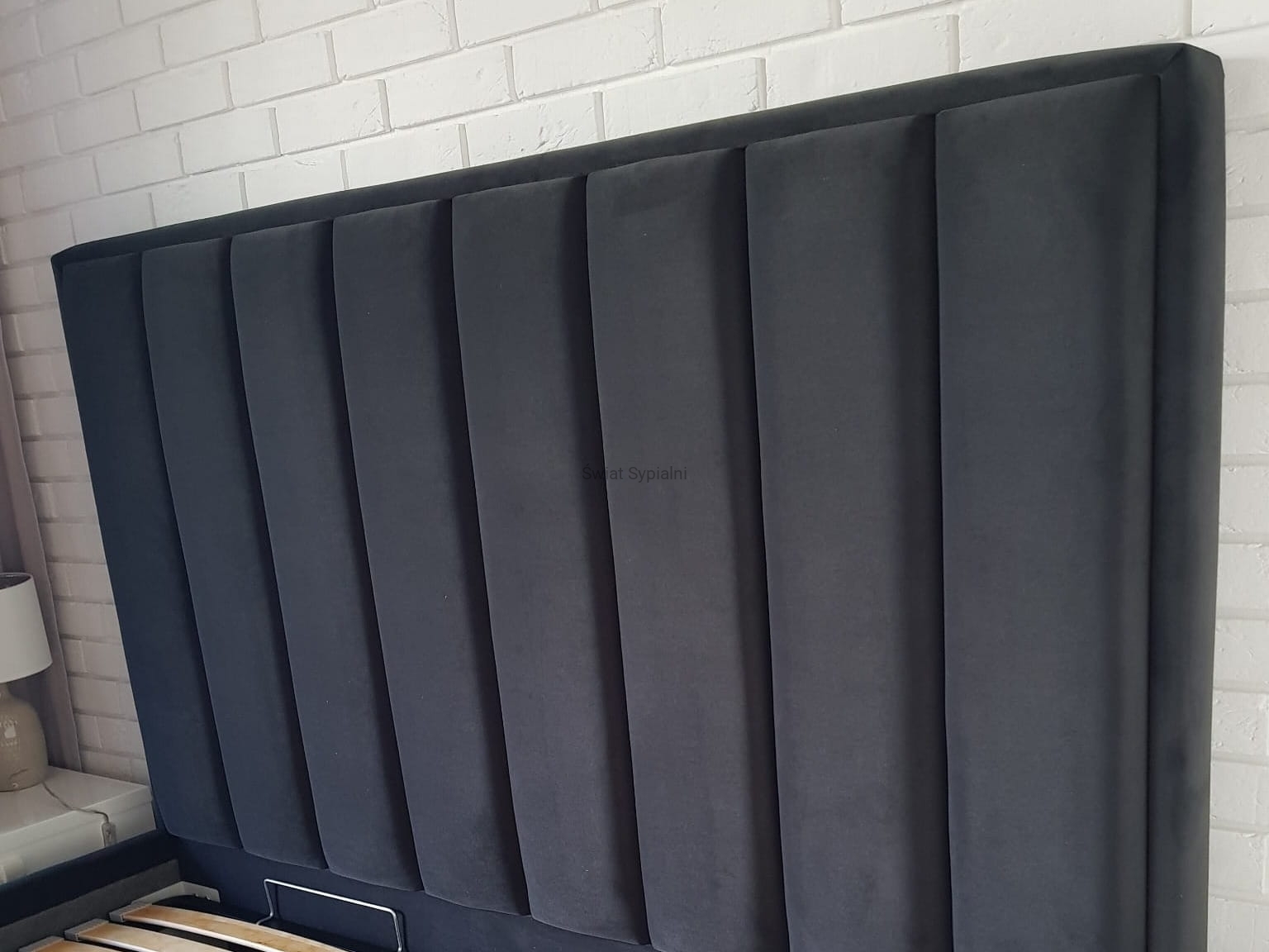 Na zdjęciu: łóżko w rozmiarze 160/200 z pojemnikiem na pościel, wysokość zagłówka 140cm, zagłówek 3D z większą ilością pianki, noga 10cm drewniana kolor czarny,