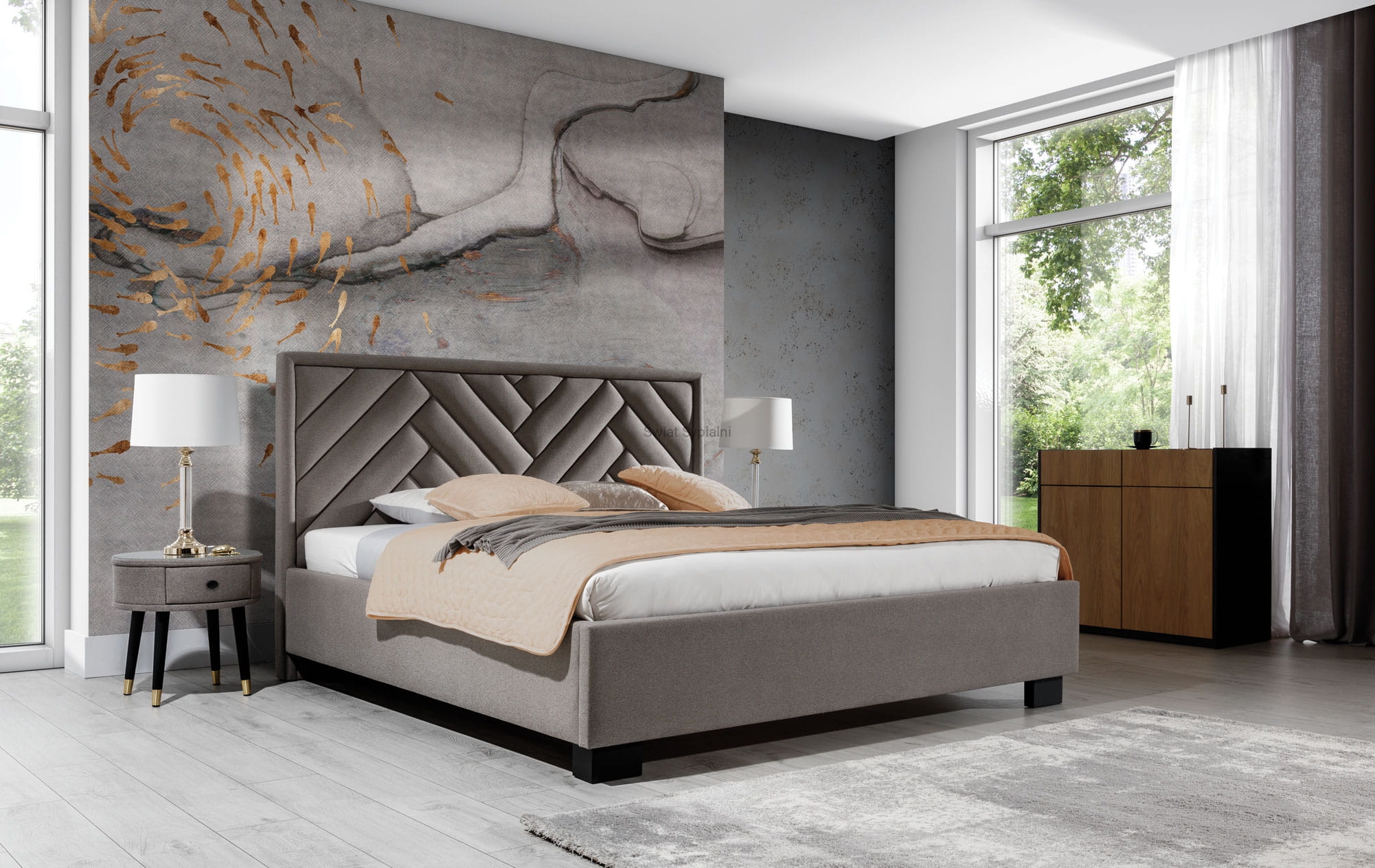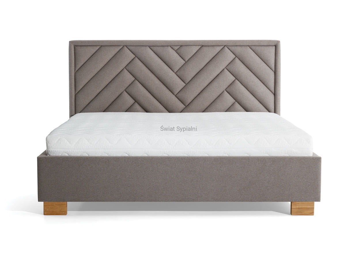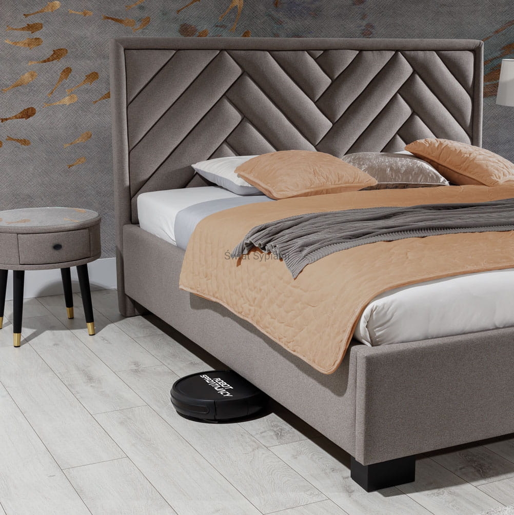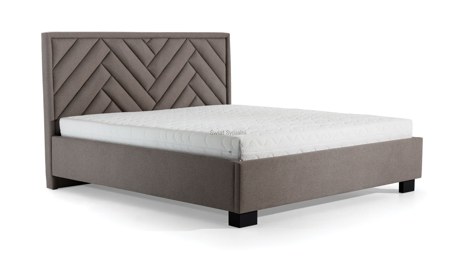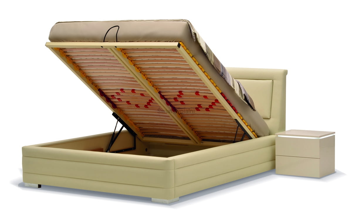 Łóżko tapicerowane z funkcjonalnym pojemnikiem na pościel, który znajduje się pod stelażem i materacem na całej wielkości łóżka. Stelaż na metalowej ramie z poprzecznymi elastycznymi listewkami jest otwierany z użyciem dwóch siłowników gazowych. Dno łóżka, płyta z okrągłymi wywietrznikami daje dodatkową cyrkulację powietrza w pojemniku gdyż jest mocowana na kątownikach w odpowiedniej wysokości od podłogi.