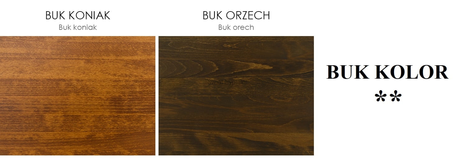 * Prezentowane zdjęcia drewna mają charakter poglądowy. Zapraszamy do naszego salonu w Piasecznie w celu zapoznania się z rzeczywistymi próbkami. W przypadku domówienia mebla drewnianego w takim samym kolorze jak zakupione wcześniej meble, może wystąpić różnica w odcieniach wybranego wybarwienia.
