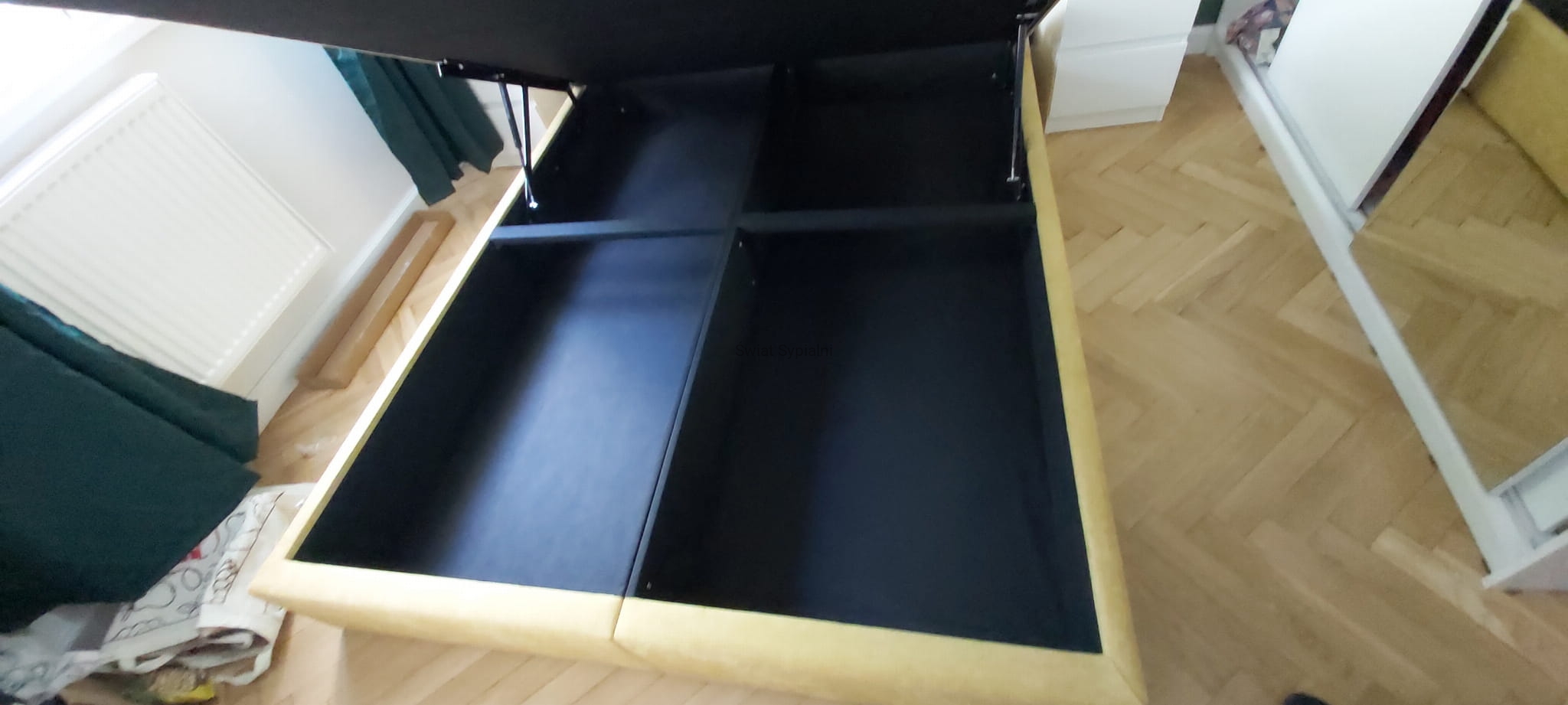 Obszerny pojemnik pozwala na ukrycie pościeli, dzięki temu sypialnia jest uporządkowana i nic nie zakłóca jej harmonii.
