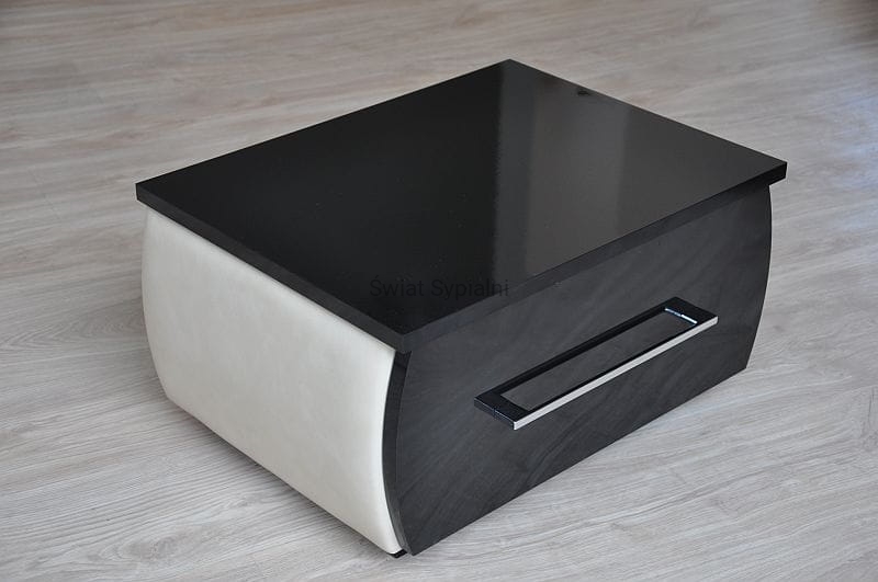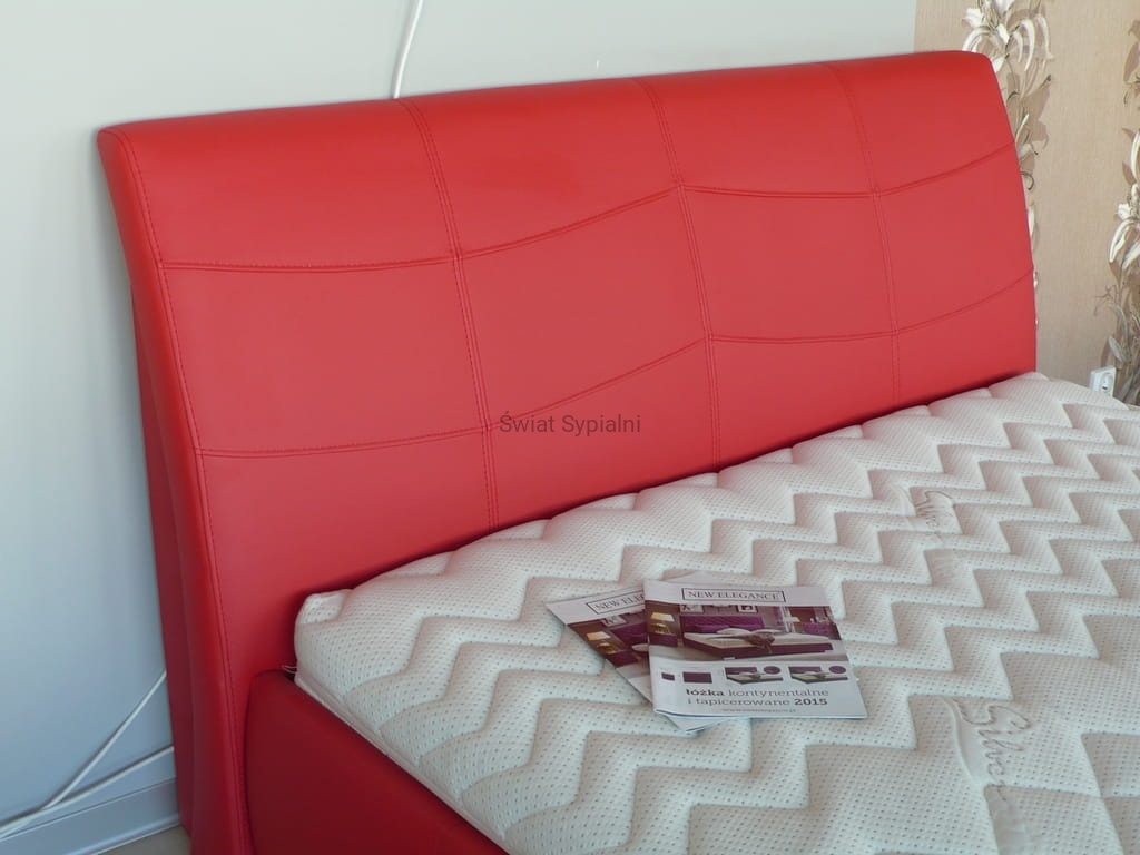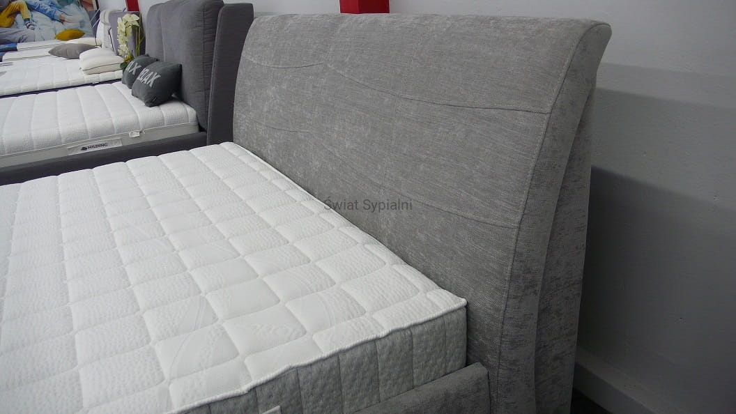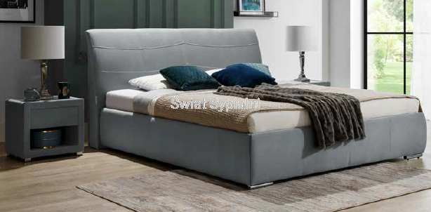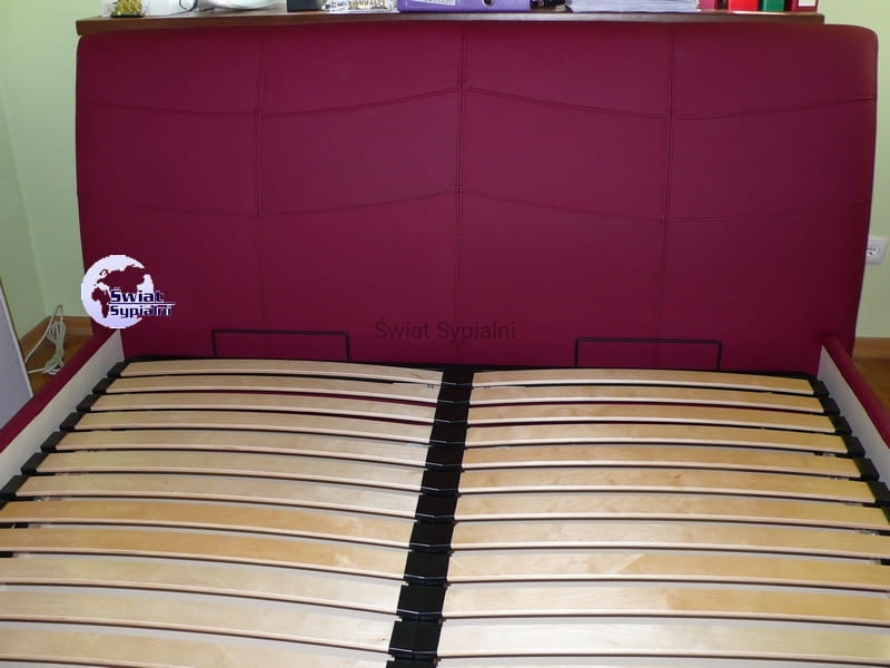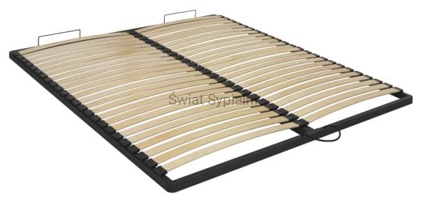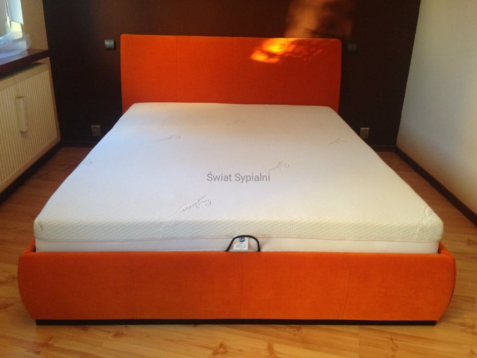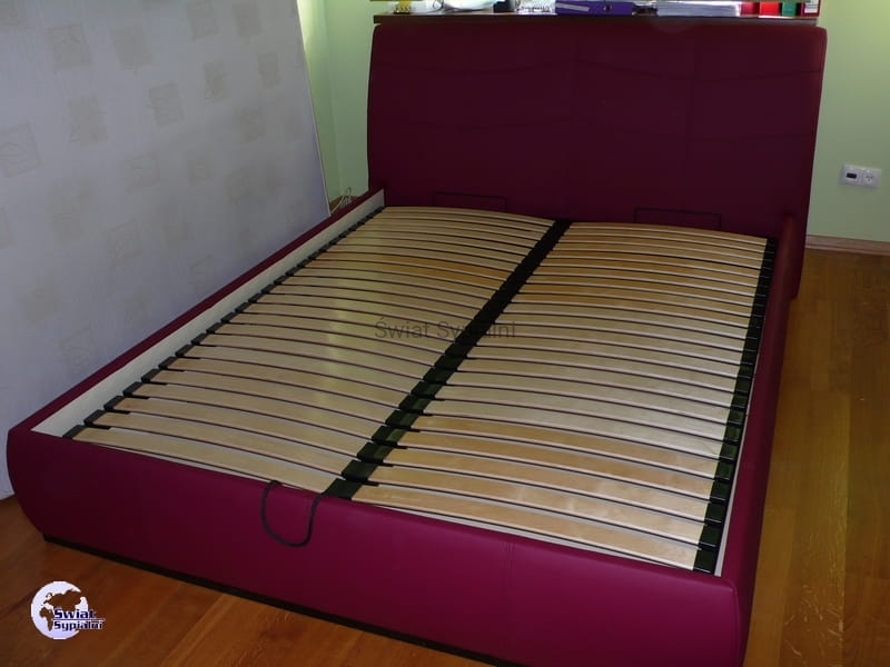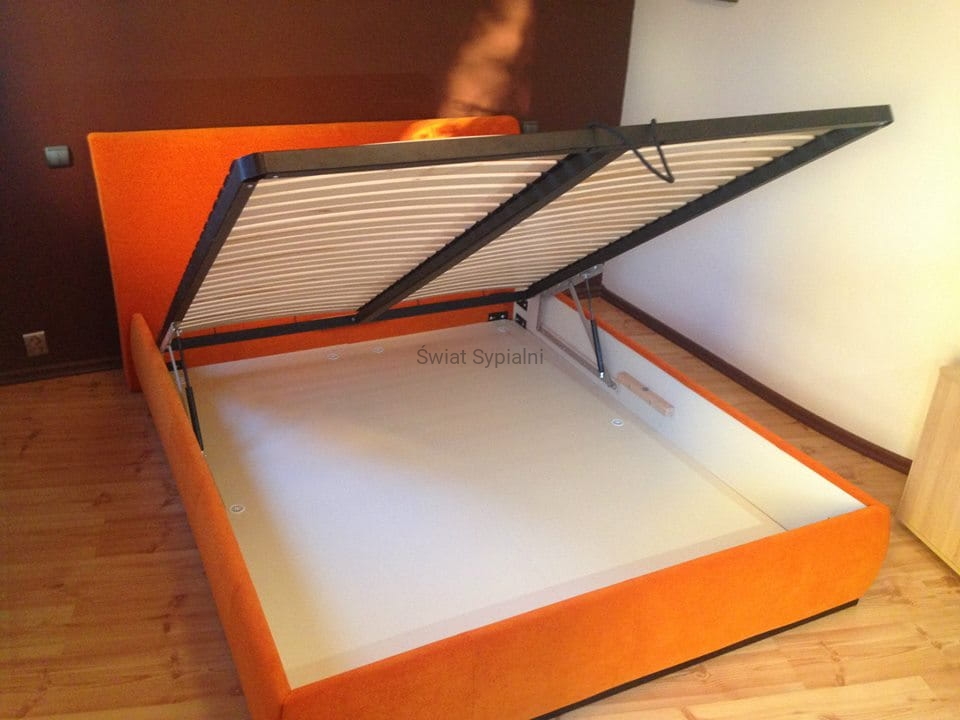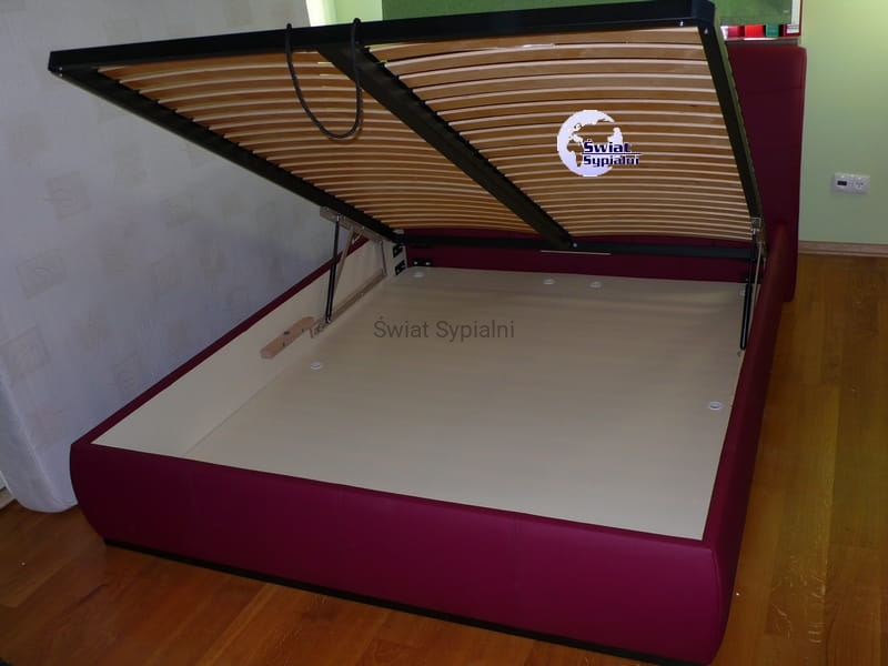 Łóżko tapicerowane z funkcjonalnym pojemnikiem na pościel, który znajduje się pod stelażem i materacem na całej wielkości łóżka. Stelaż na metalowej ramie z poprzecznymi elastycznymi listewkami jest otwierany z użyciem dwóch siłowników gazowych. Dno łóżka, płyta z okrągłymi wywietrznikami daje dodatkową cyrkulację powietrza w pojemniku gdyż jest mocowana na kątownikach w odpowiedniej wysokości od podłogi.