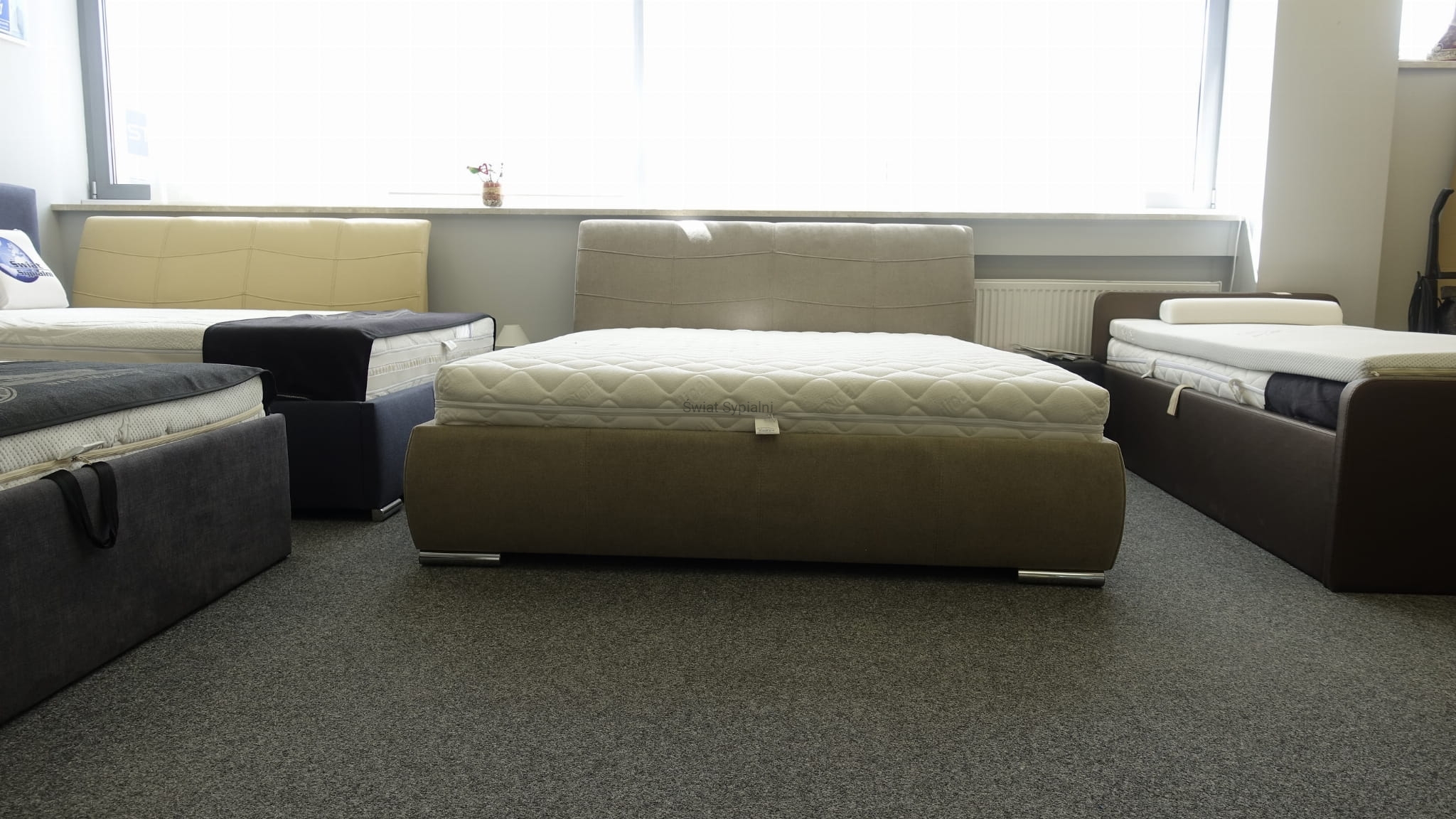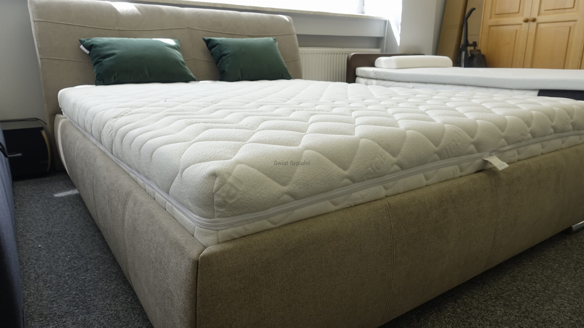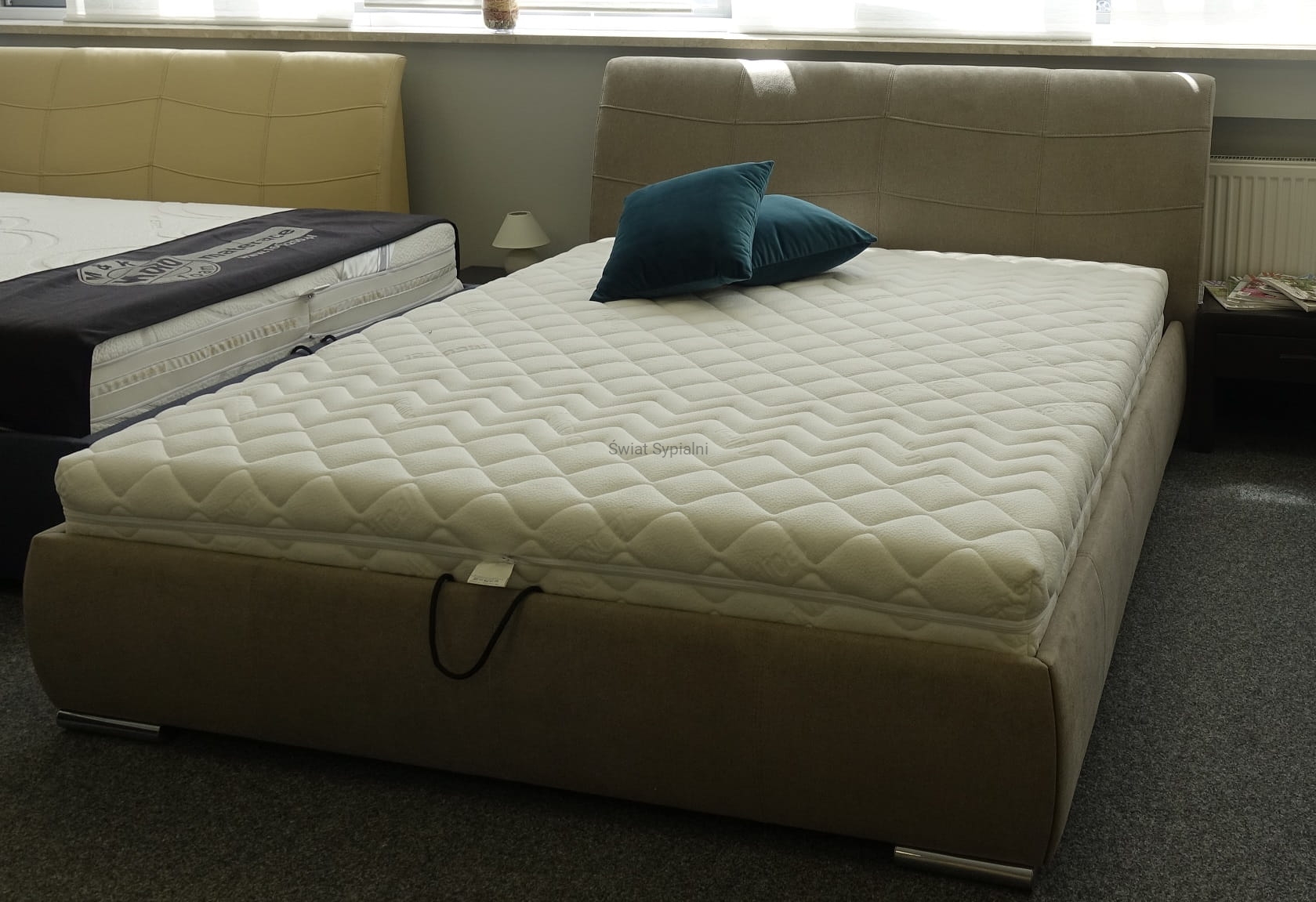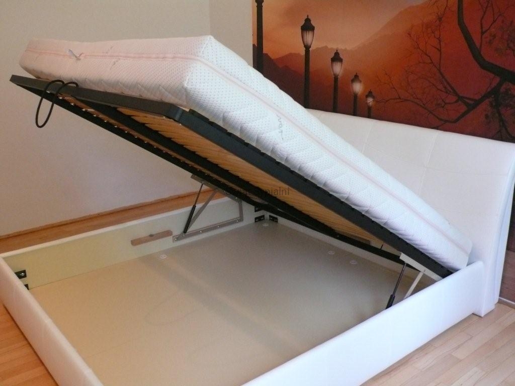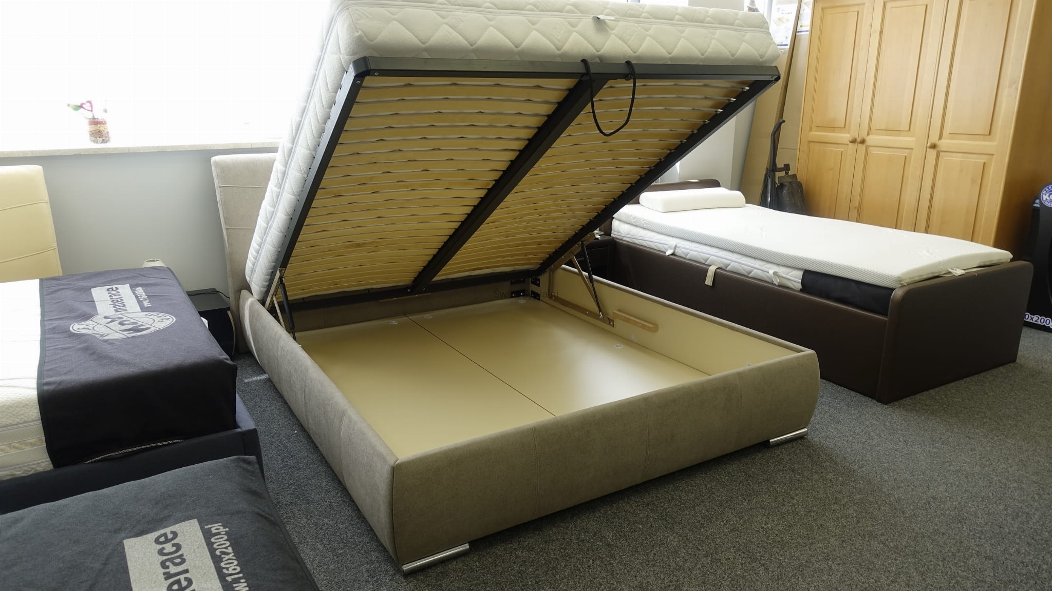 Łóżko tapicerowane z funkcjonalnym pojemnikiem na pościel, który znajduje się pod stelażem i materacem na całej wielkości łóżka. Stelaż na metalowej ramie z poprzecznymi elastycznymi listewkami jest otwierany z użyciem dwóch siłowników gazowych. Dno łóżka, płyta z okrągłymi wywietrznikami daje dodatkową cyrkulację powietrza w pojemniku gdyż jest mocowana na kątownikach w odpowiedniej wysokości od podłogi.