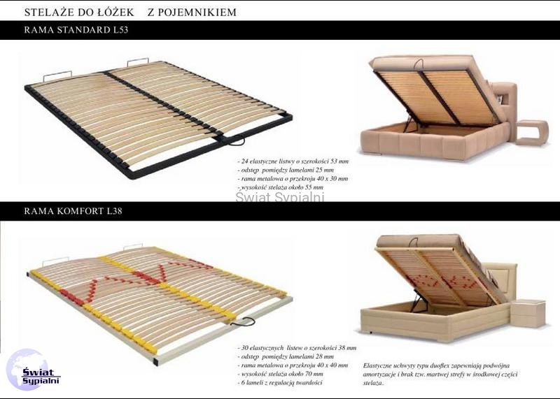 Rama Standard L53 - to metalowy stelaż łóżka z pojemnikiem zapewniający użytkownikowi zadowalającą jakość przy zachowaniu bardzo przystępnej ceny. Budowa tego stelaża została oparta na systemie elastycznych listew wykonanych z warstwowo klejonego drewna liściastego umocowanych na metalowej ramie. Belka środkowa tejże ramy posiada obustronne dodatkowe wzmocnienie. Małe odstępy pomiędzy listwami pozwalają na wykorzystanie ramy do każdego typu materaca również do hoteli i pensjonatów.
