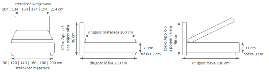 Całkowita szerokość łóżka: 134 cm, 154 cm, 174 cm, 194 cm i 214 cm