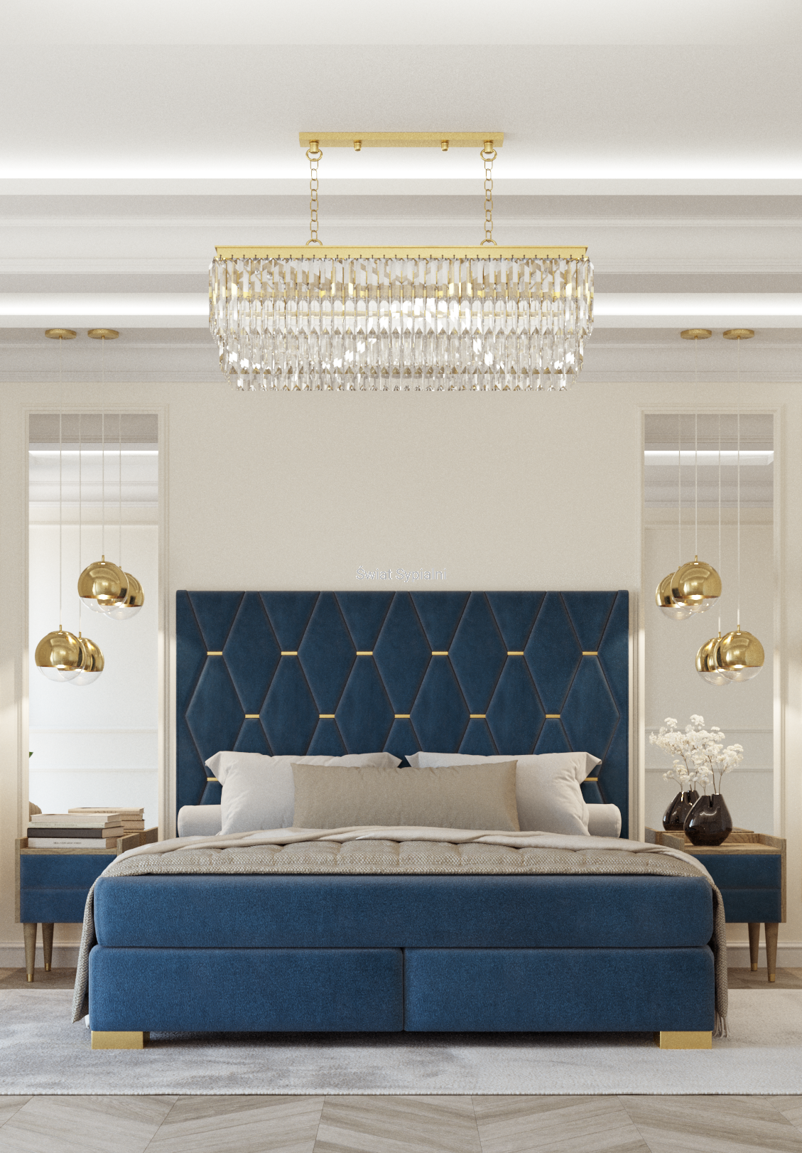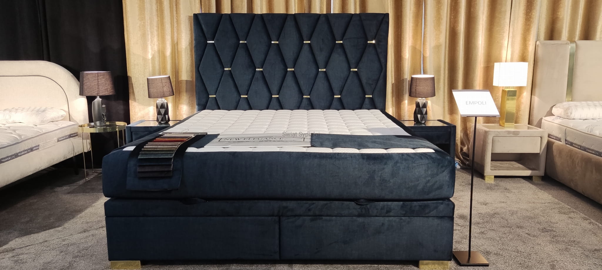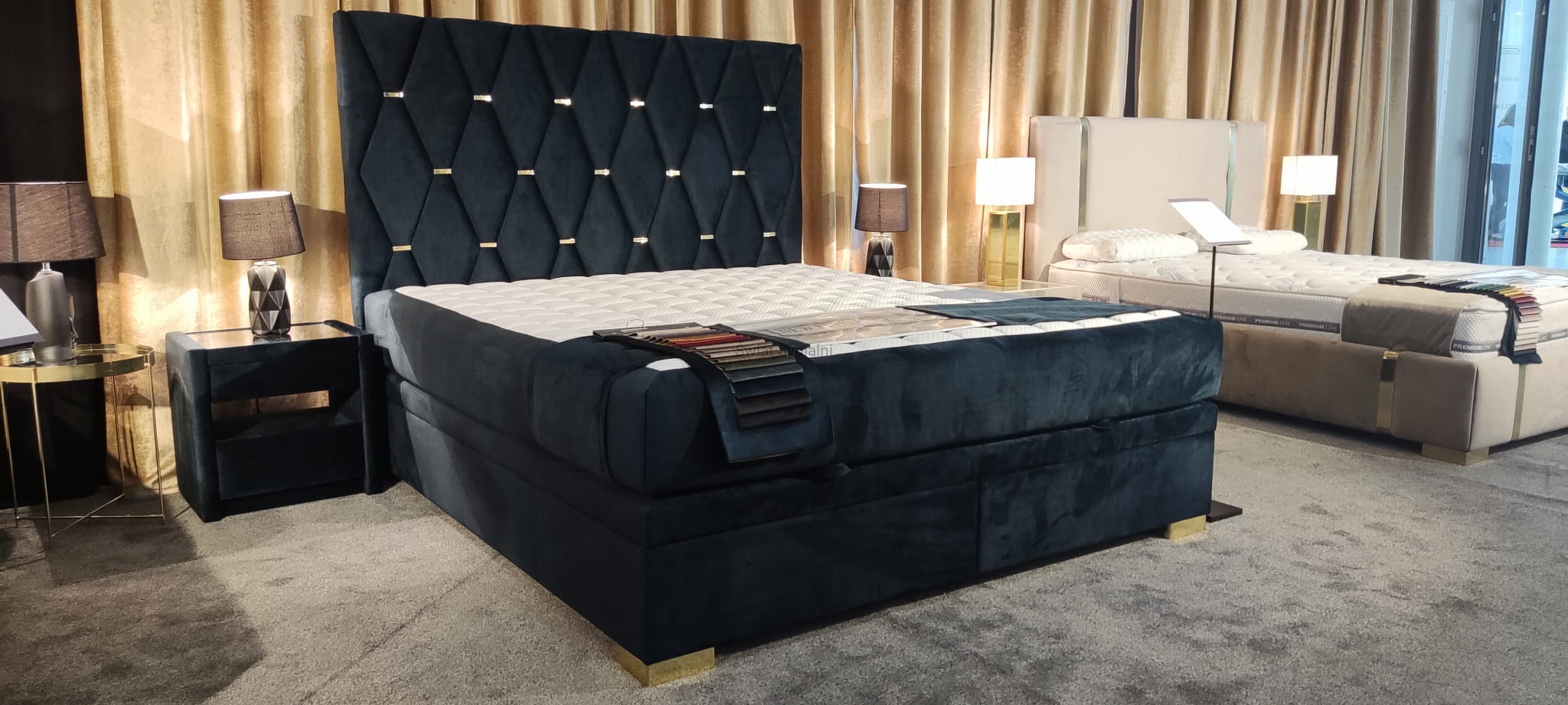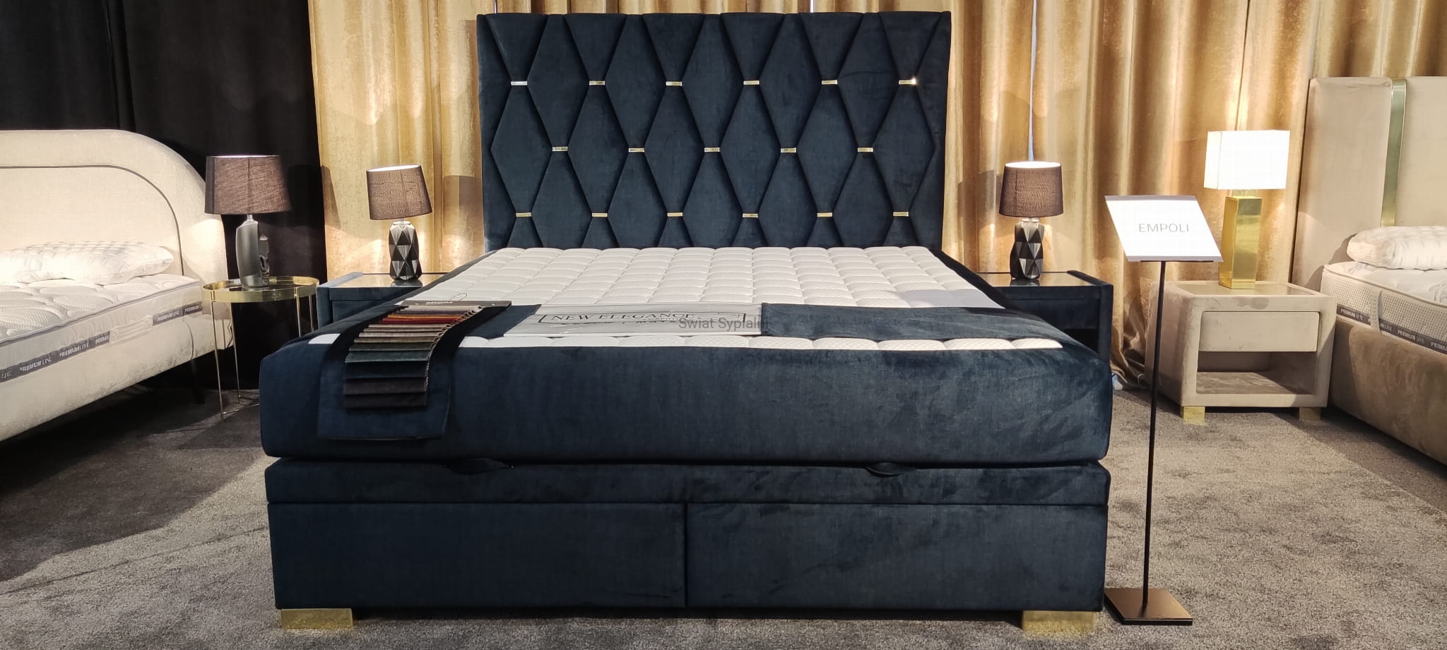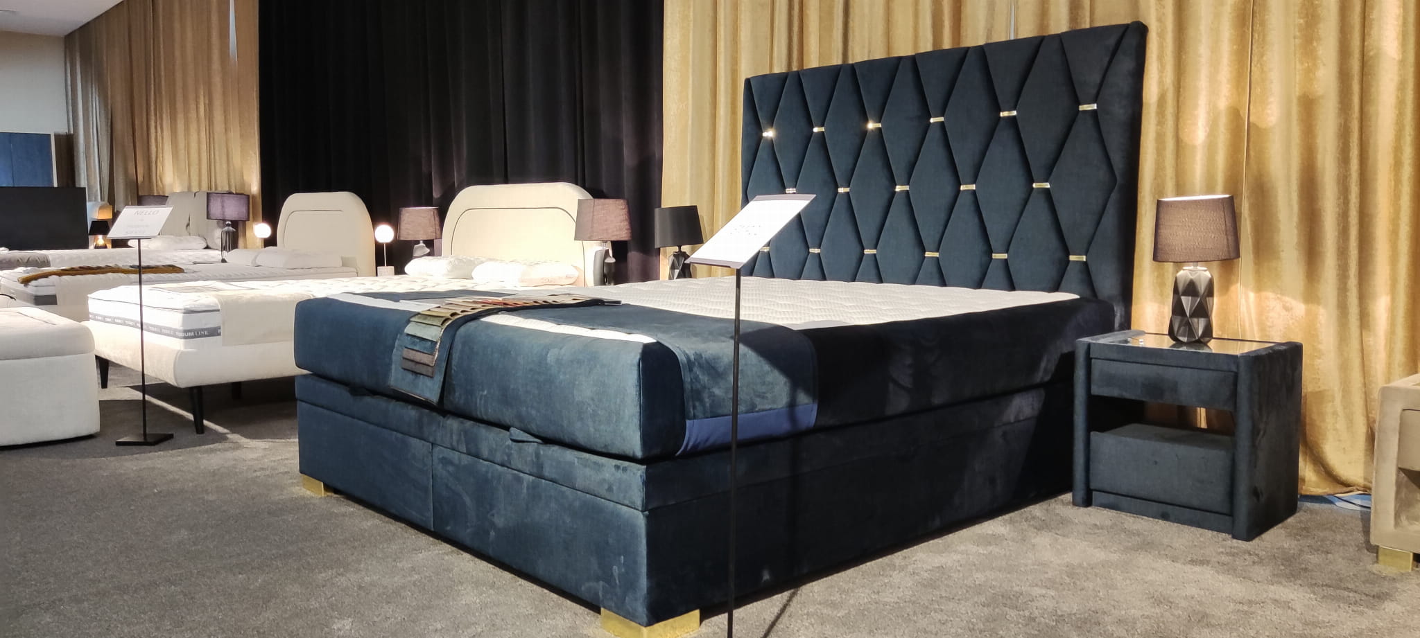 Na zdjęciu: rozmiar 160/200, wysokość zagłówka 125cm, podstawa kontynentalna Z, nogi złote metalowe, obicie: Decoma Sora Ocean 13 (gr.4)