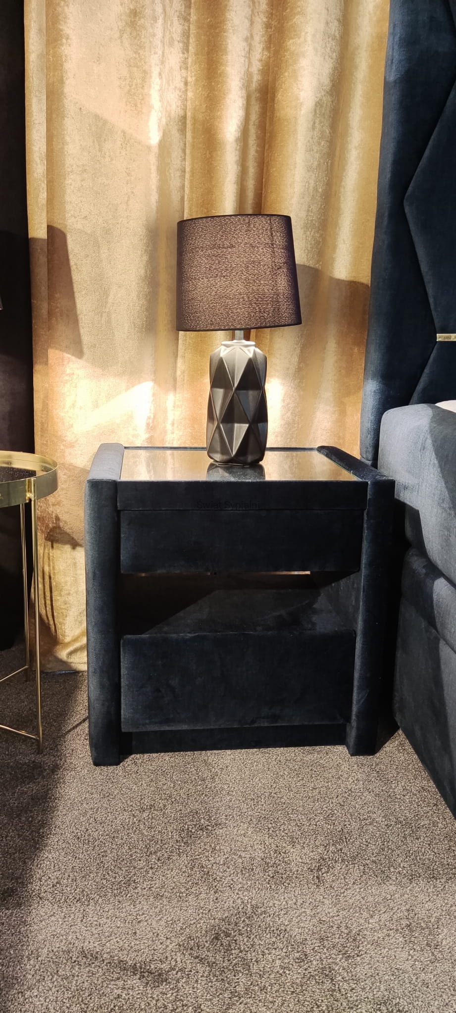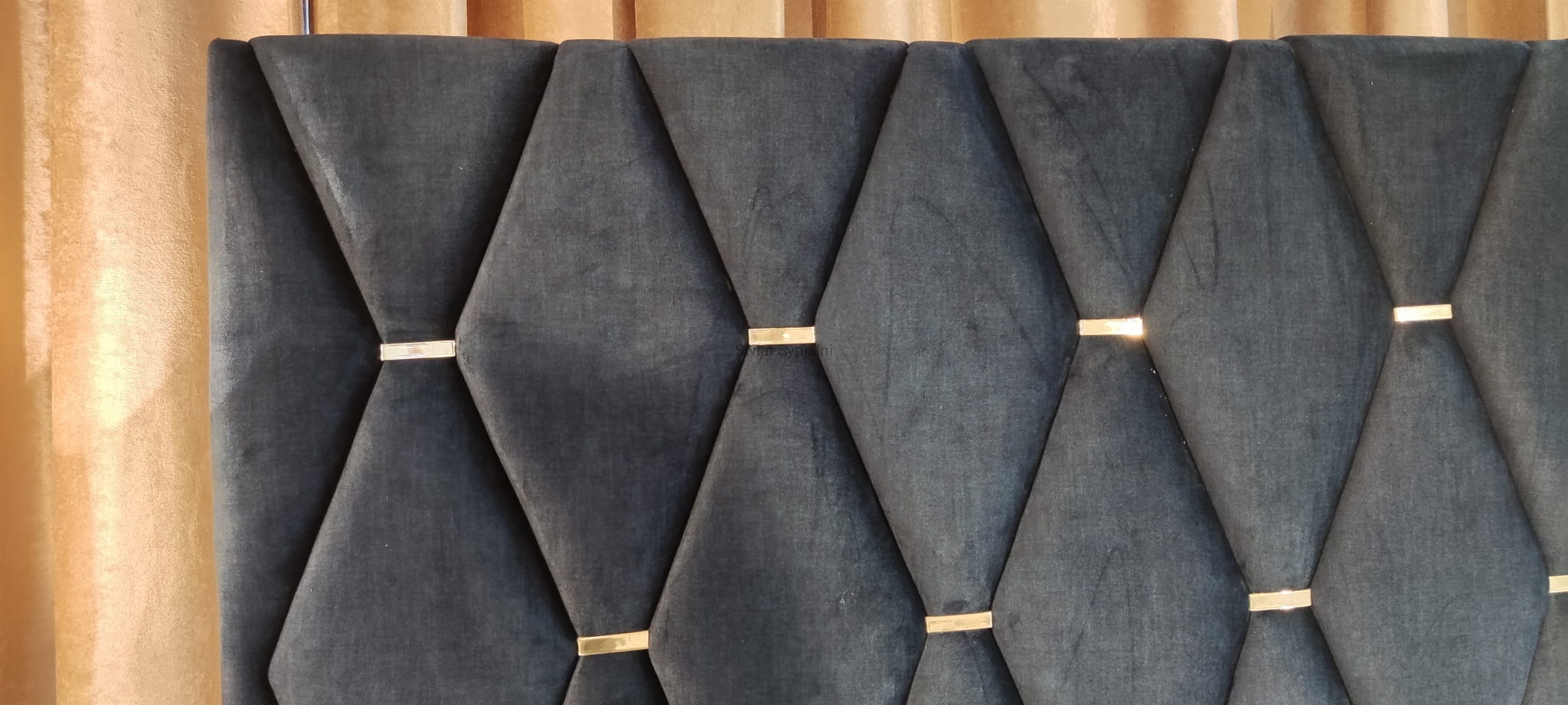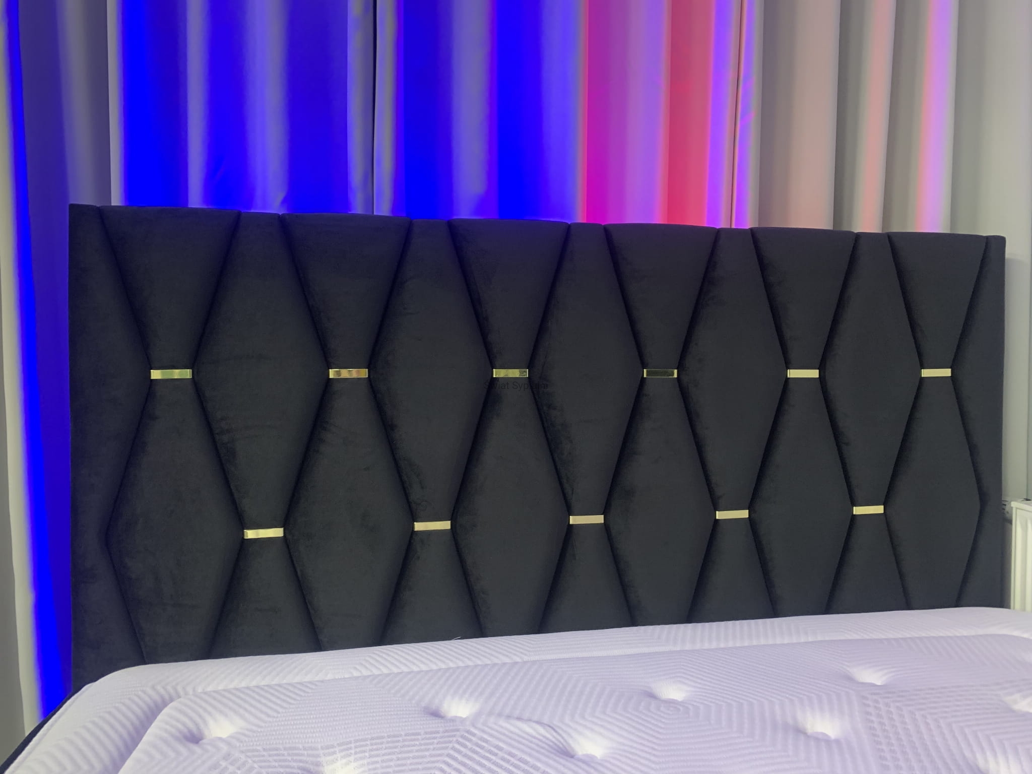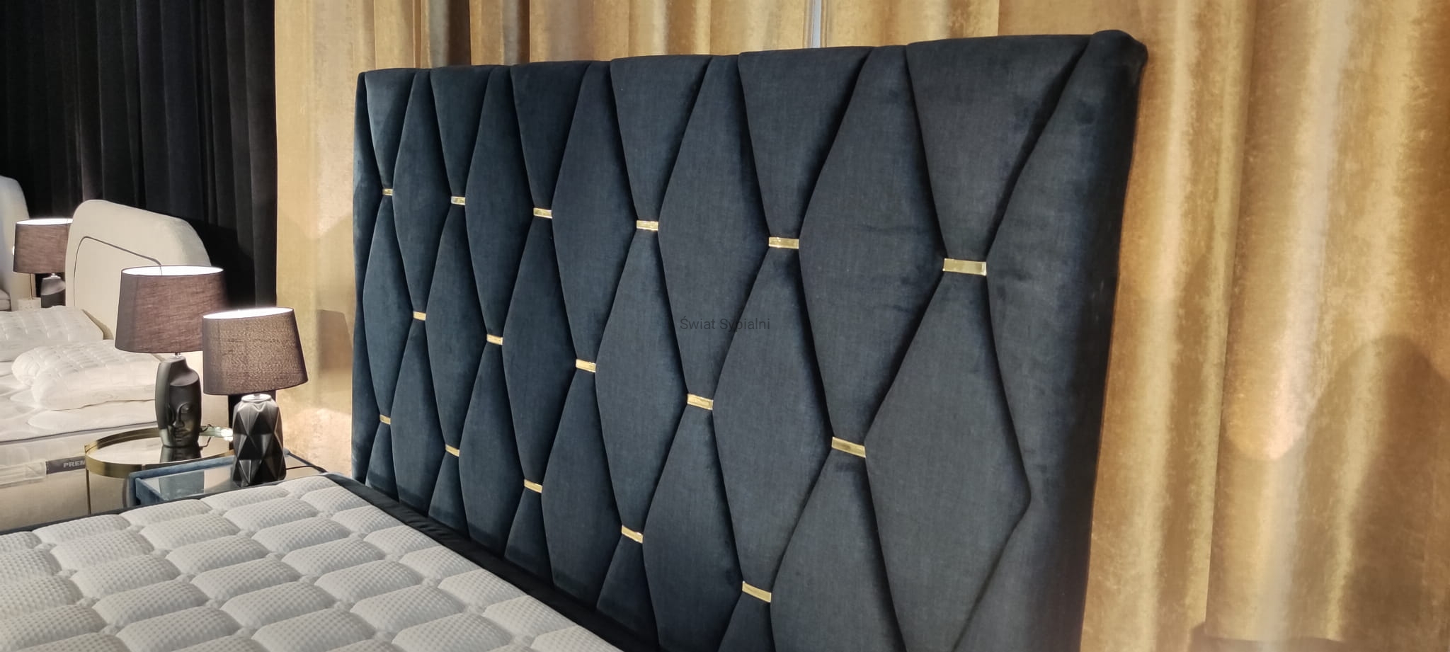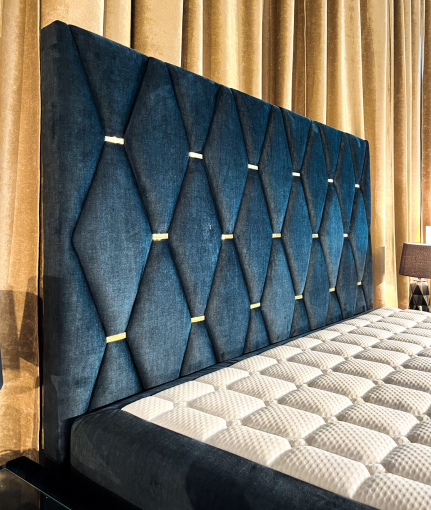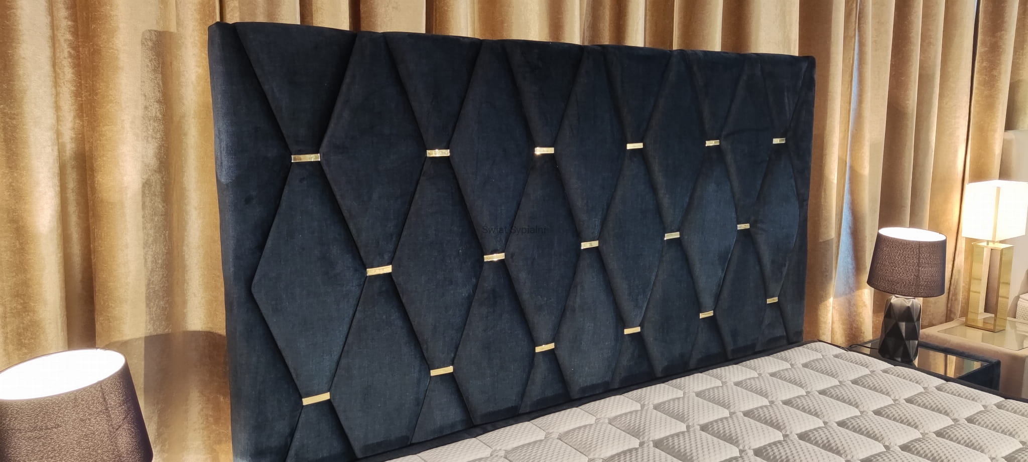 Geometryczne tapicerowane wezgłowie ze złotymi ozdobnymi klamrami,