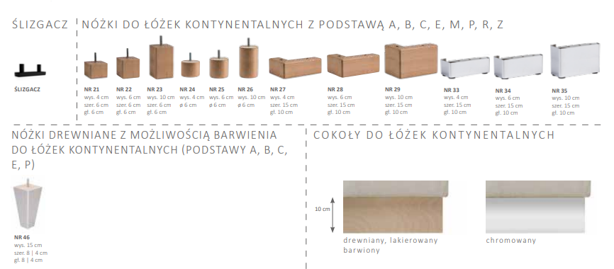 Pełne zestawienie nóżek do łóżek kontynentalnych