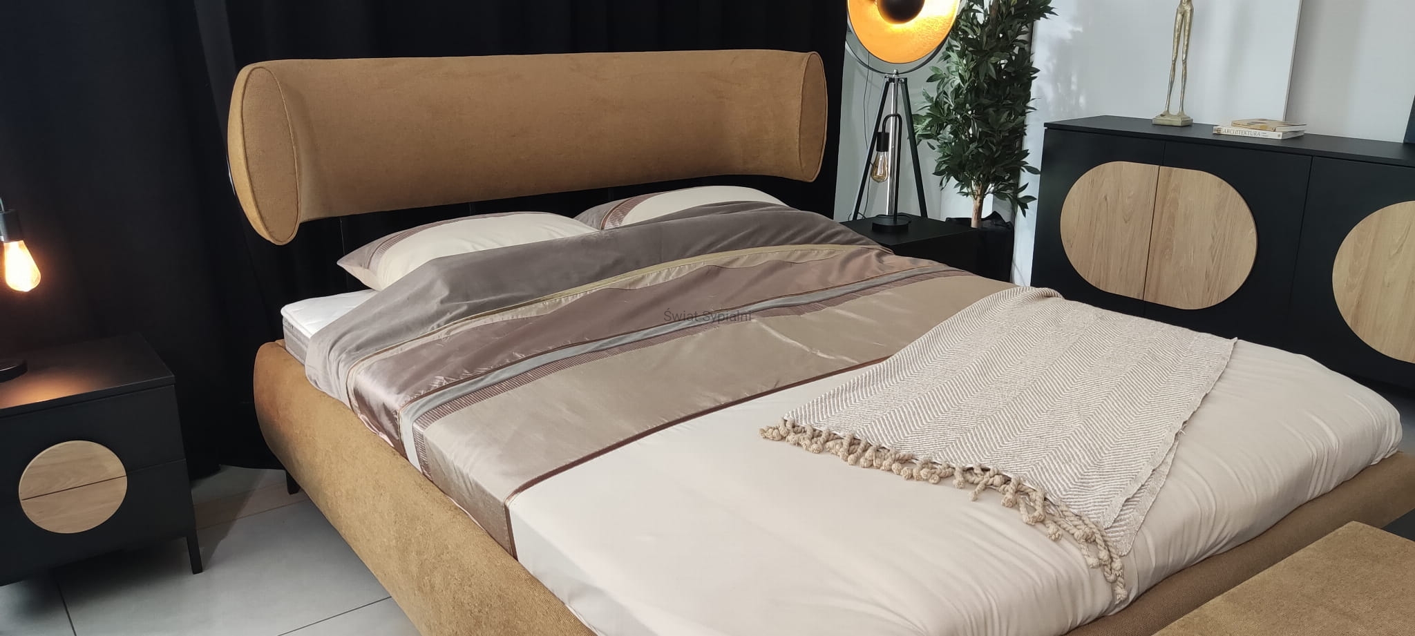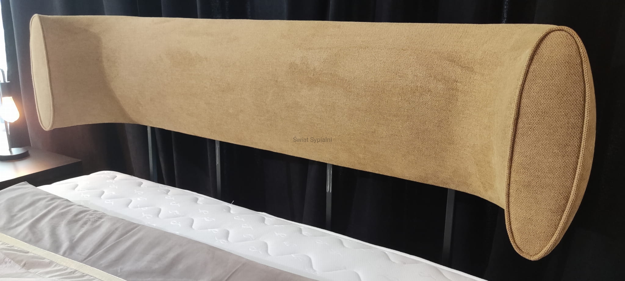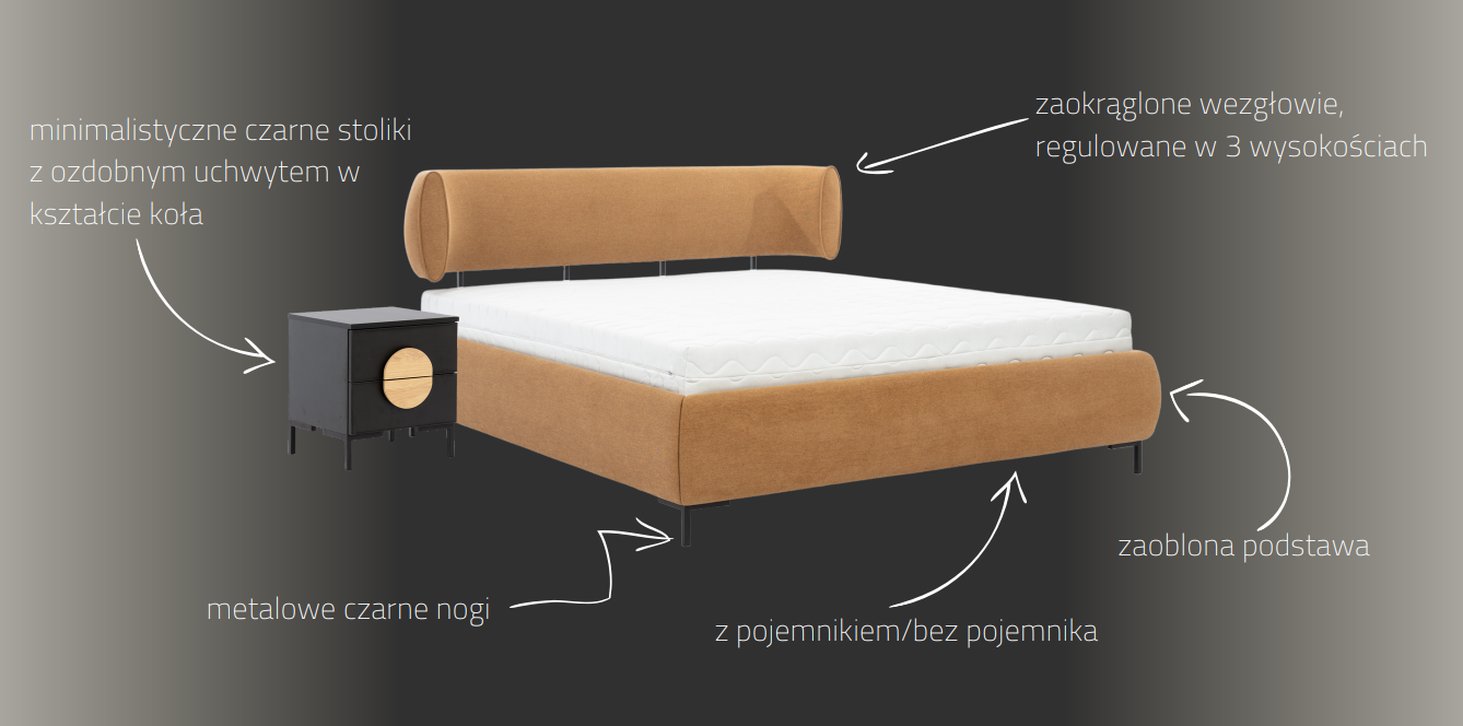 Łóżko z zaokrąglonym, designerskim wezgłowiem, zakończonym owalnymi elementami z ozdobną lamówką. Wysokość zagłówka łóżka regulowana w trzech wysokościach.