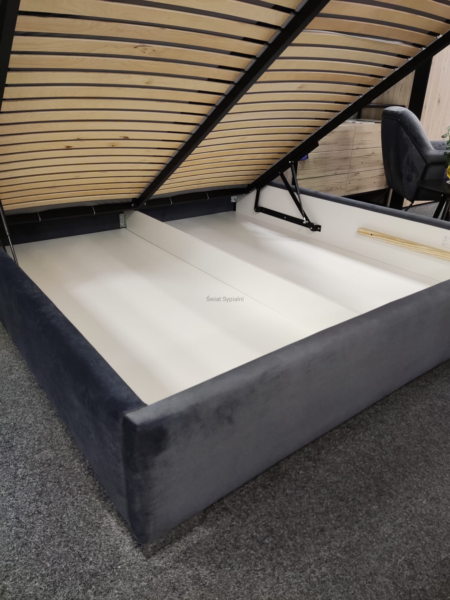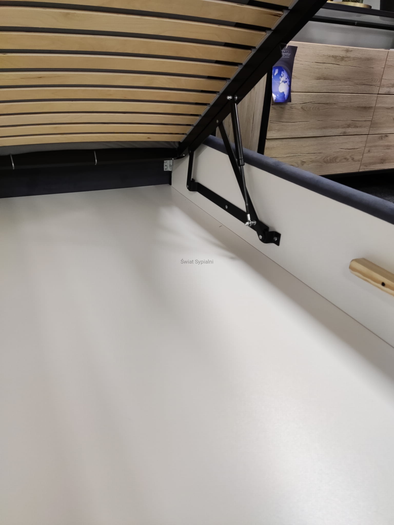 System unoszenia stelaża, oparty na siłownikach gazowych, które zapewniają komfortowe korzystanie z pojemnika nawet przy znacznej wadze materaca.