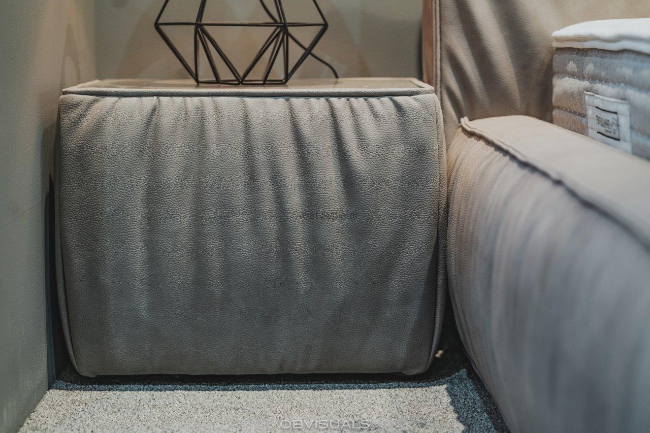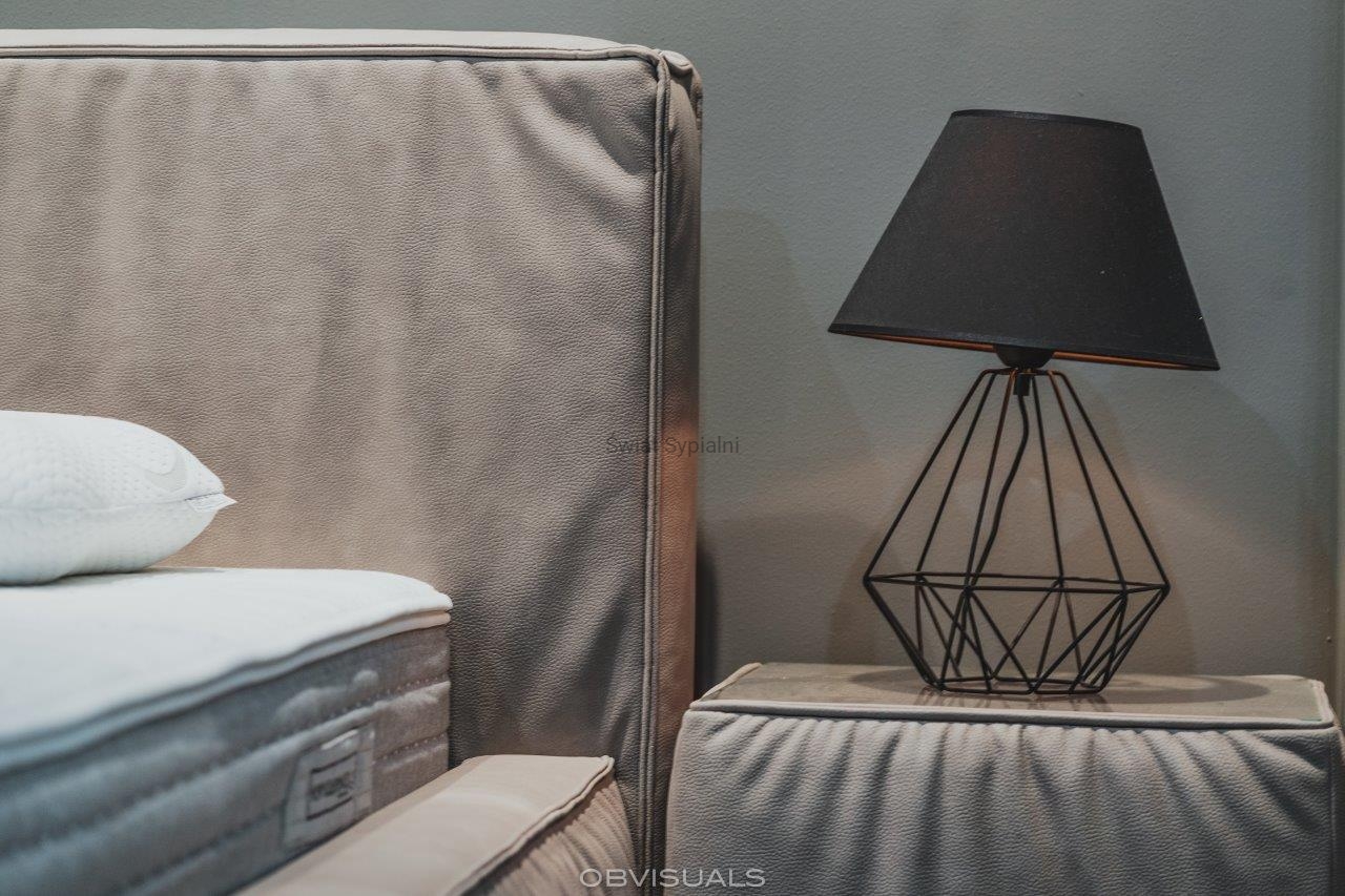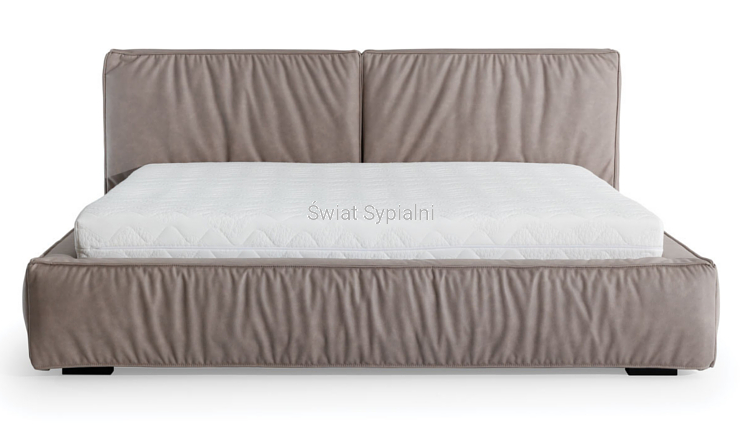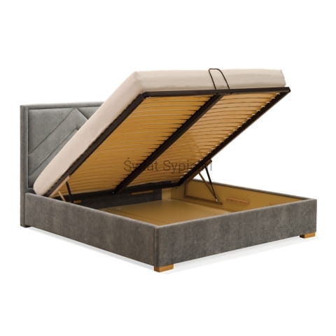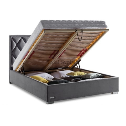 Łóżko tapicerowane z funkcjonalnym pojemnikiem na pościel, który znajduje się pod stelażem i materacem na całej wielkości łóżka. Stelaż na metalowej ramie z poprzecznymi elastycznymi listewkami jest otwierany z użyciem dwóch siłowników gazowych. Dno łóżka, płyta z okrągłymi wywietrznikami daje dodatkową cyrkulację powietrza w pojemniku gdyż jest mocowana na kątownikach w odpowiedniej wysokości od podłogi.