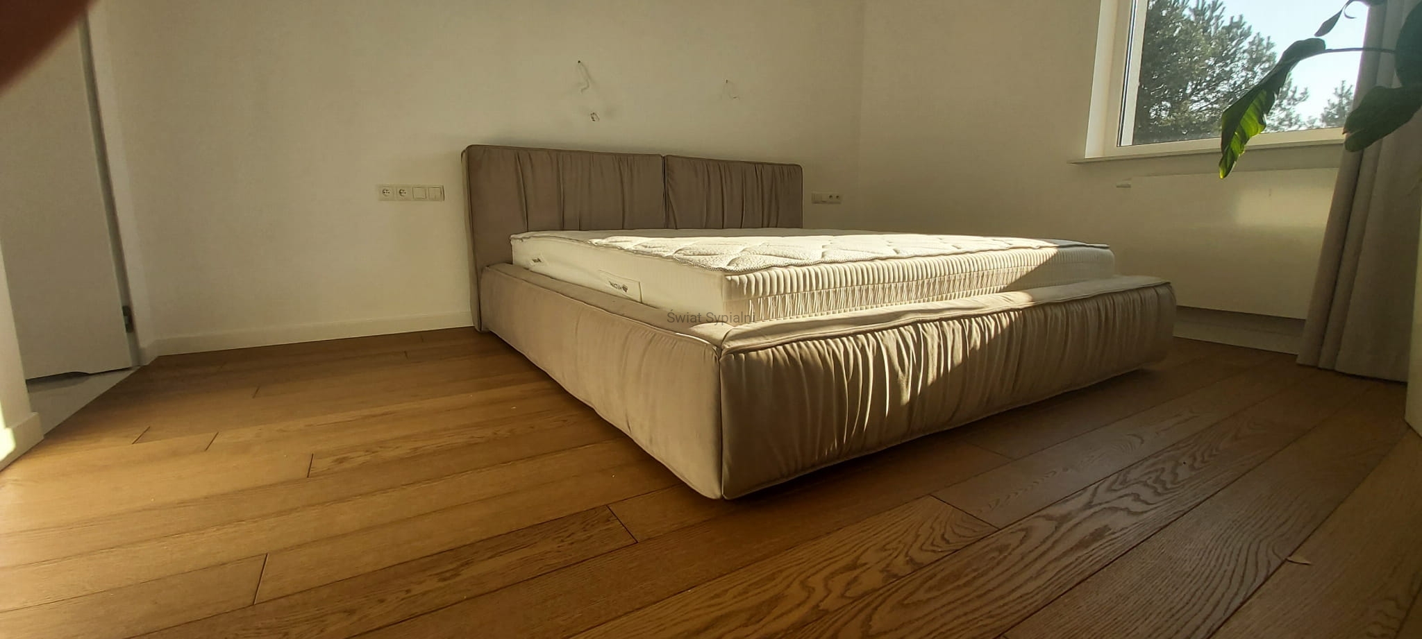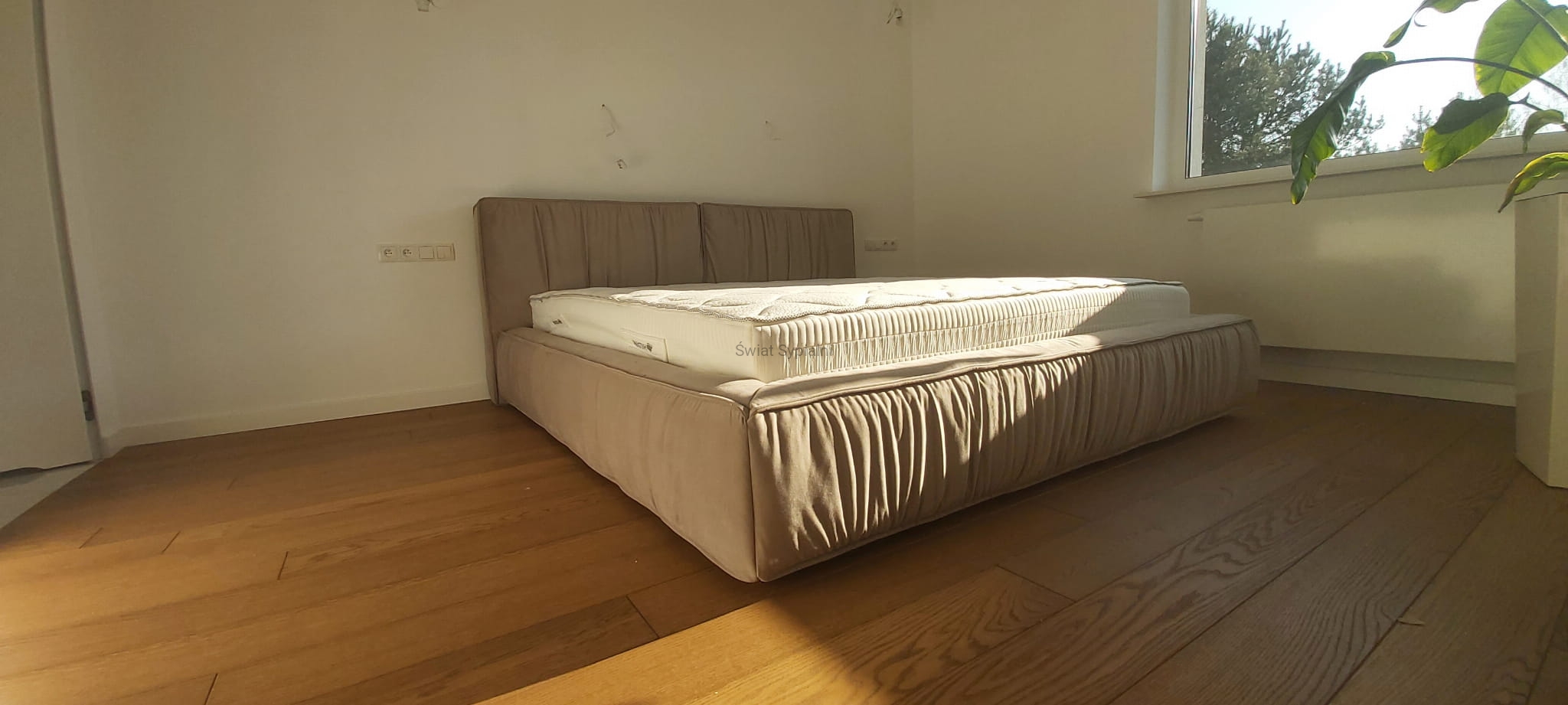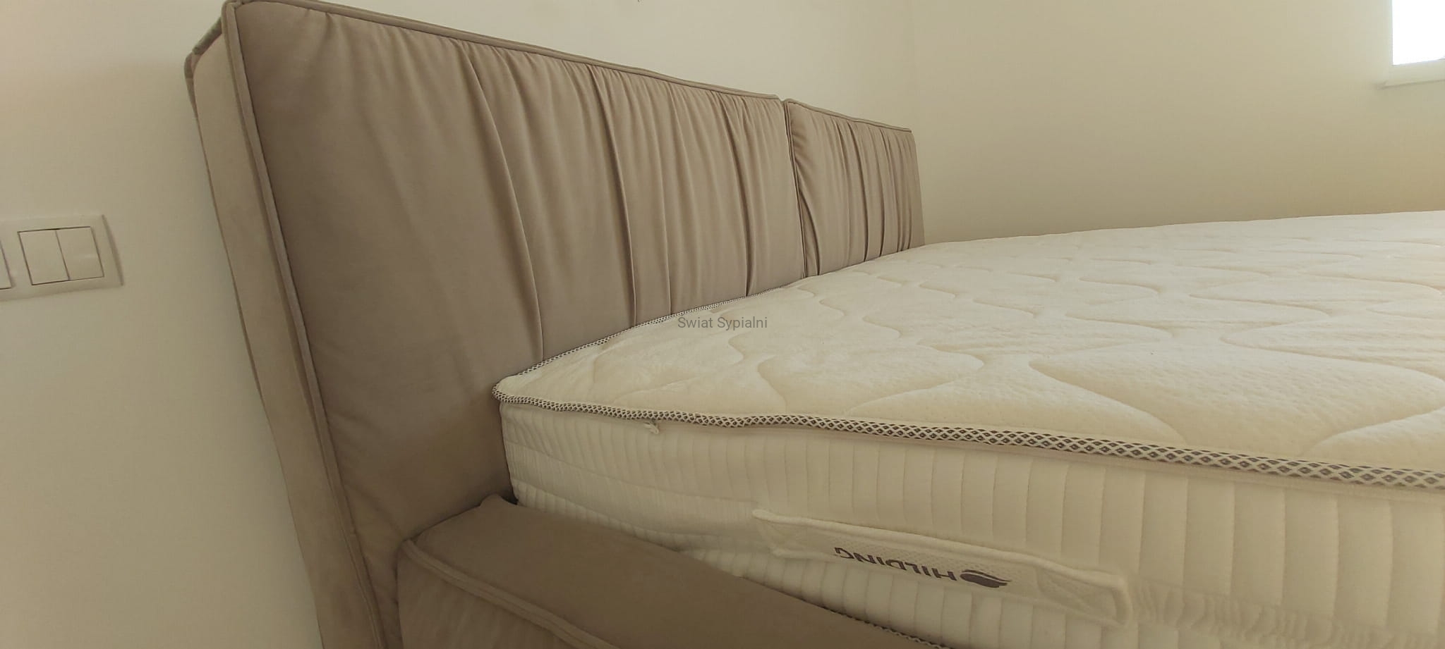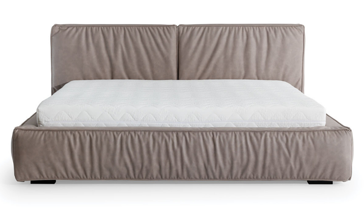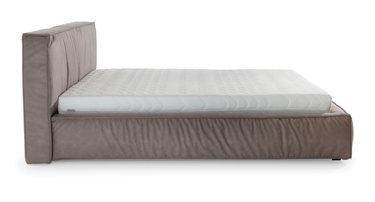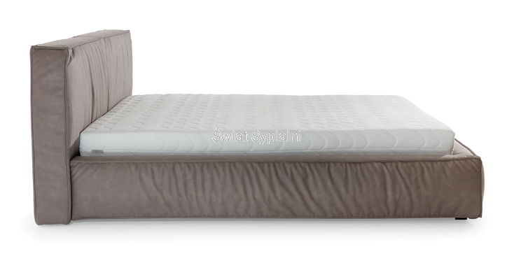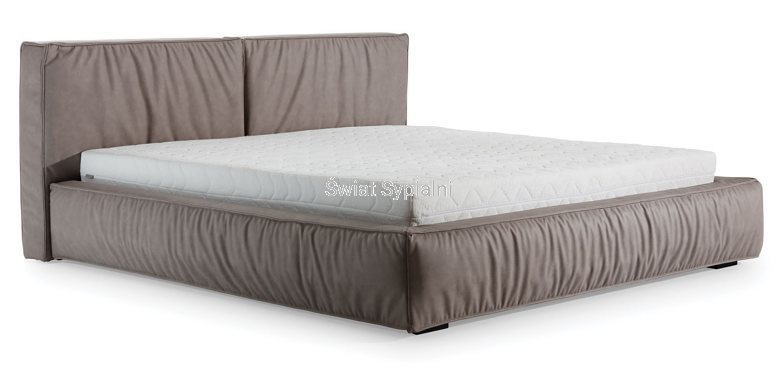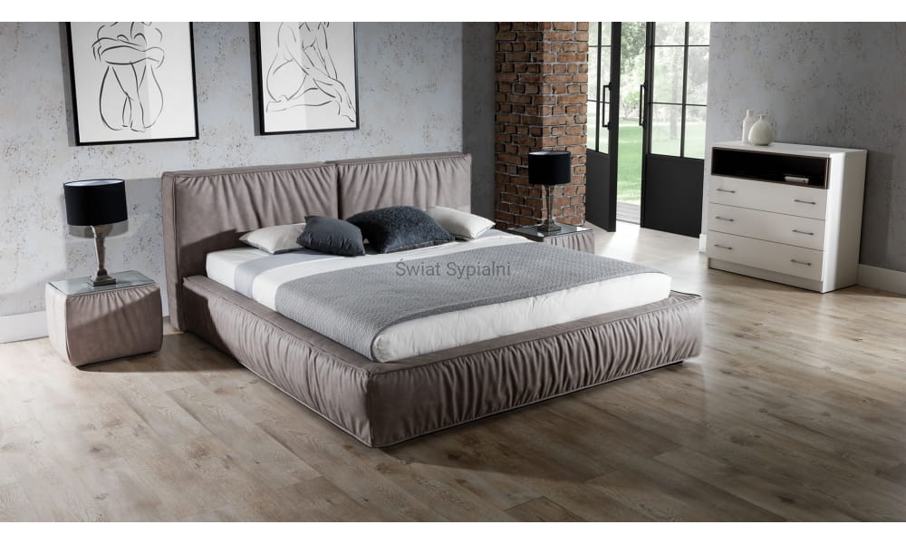 Nowe łóżko z grubym, geometrycznym, dzielonym pionowo na dwie części zagłówkiem z ozdobnymi szwami i marszczeniami. Minimalistyczne włoskie wzornictwo doskonale komponujące się z różnymi elementami innych zestawów do sypialni.