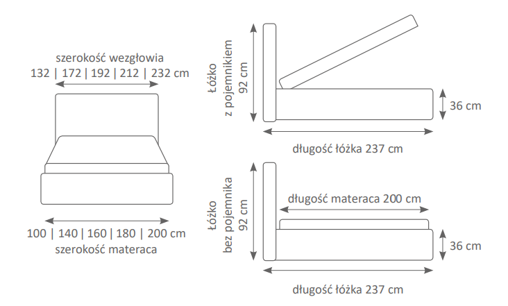 Całkowita szerokość łóżka: 172, 192, 212 oraz 232 cm