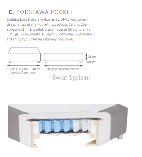 Wysokość ramy 9 cm, solidna rama wykonana z drewna, podkład pod sprężyny z płyty wiórowej o gr. 1 cm, sprężyna POCKET (wys. 6 cm, 255 sprężyn/m2), pianka T25 grubości 1 cm, wojłok o gramaturze 500 g, poszycie z materiału obiciowego oraz tkaniny typu dżersej.