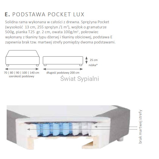 Podstawa "P" posiada ramę wykonaną z drewna, lamele - 20 elastycznych listew o szerokości 53 mm, odstęp pomiędzy lamelami 40 mm, pianka T25 grubości 1 cm, wojłok o gramaturze 500 g, fibertex.