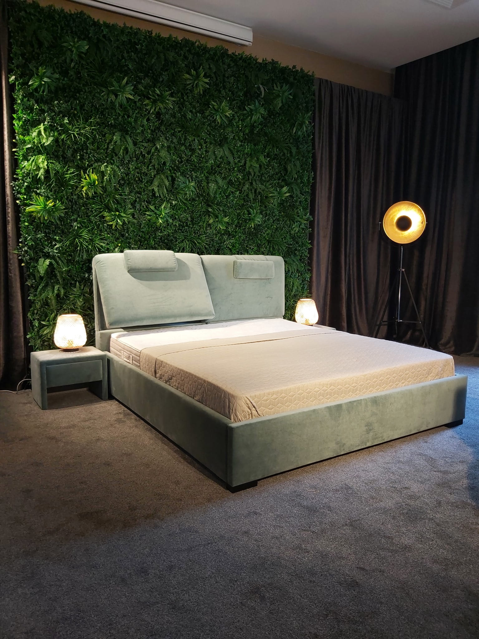 Łóżko tapicerowane z funkcjonalnym pojemnikiem na pościel, który znajduje się pod stelażem i materacem na całej wielkości łóżka. Stelaż na metalowej ramie z poprzecznymi elastycznymi listewkami jest otwierany z użyciem dwóch siłowników gazowych. Dno łóżka, płyta z okrągłymi wywietrznikami daje dodatkową cyrkulację powietrza w pojemniku gdyż jest mocowana na kątownikach w odpowiedniej wysokości od podłogi.