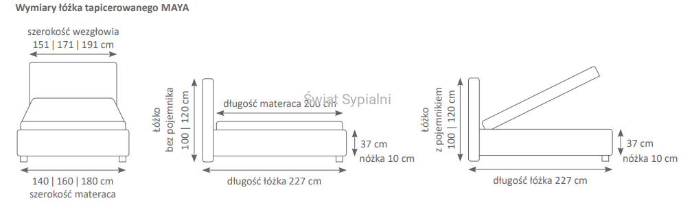 Łóżko dostępne jest w 3 szerokościach: 140/200, 160/200 oraz 180/200 cm