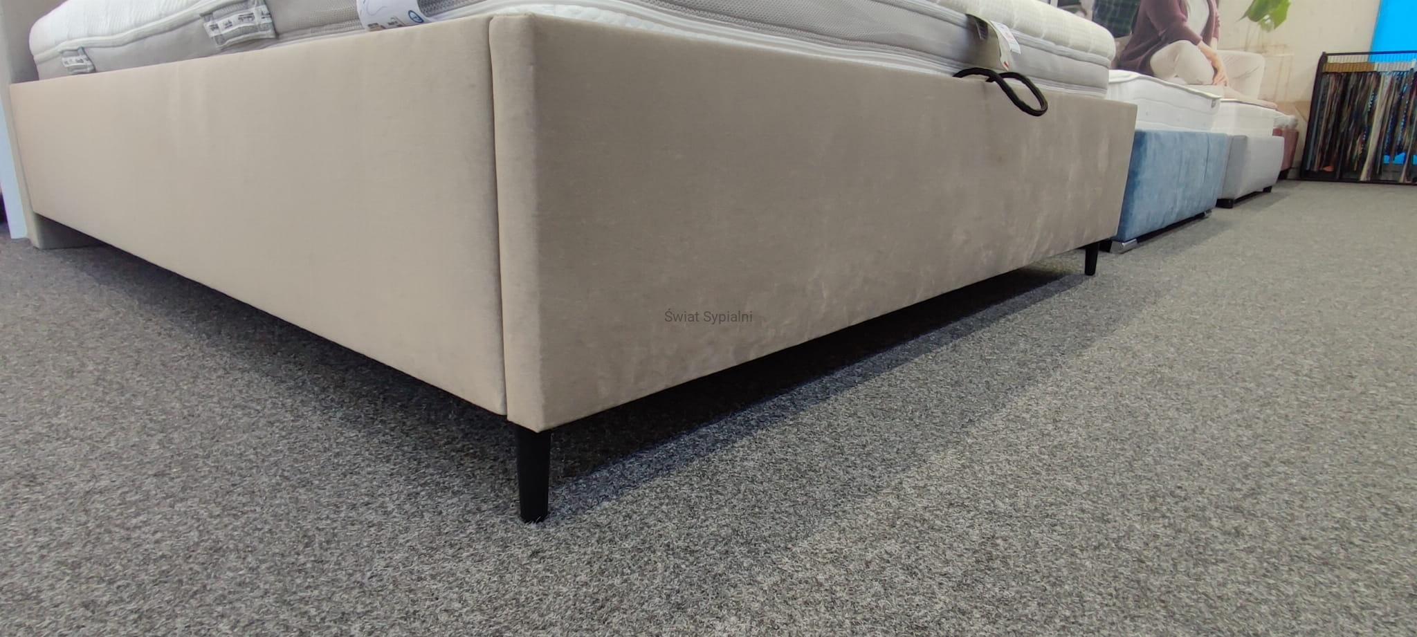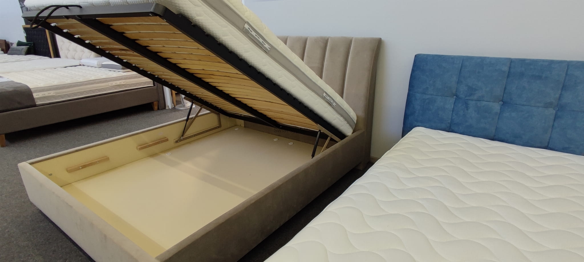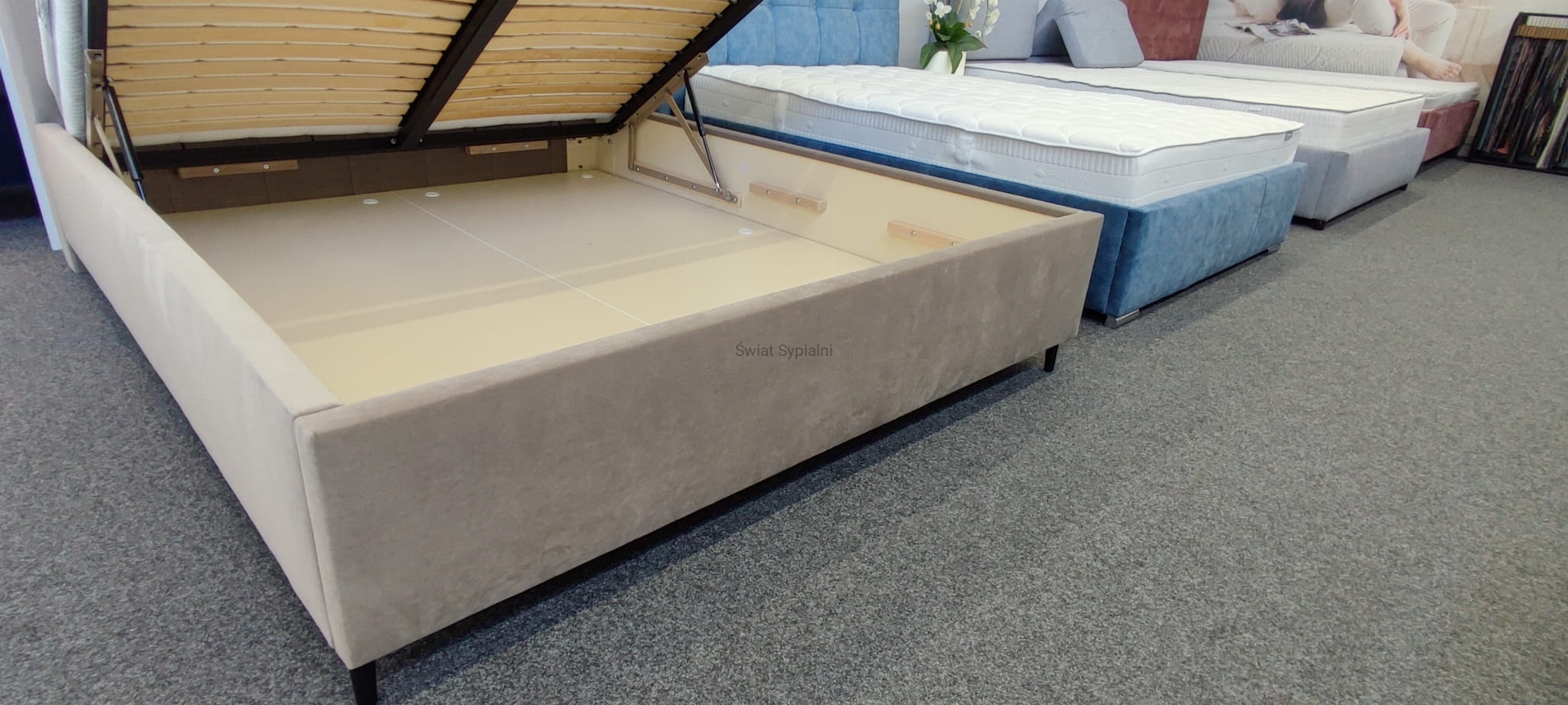 Łóżko tapicerowane z funkcjonalnym pojemnikiem na pościel, który znajduje się pod stelażem i materacem na całej wielkości łóżka. Stelaż na metalowej ramie z poprzecznymi elastycznymi listewkami jest otwierany z użyciem dwóch siłowników gazowych. Dno łóżka, płyta z okrągłymi wywietrznikami daje dodatkową cyrkulację powietrza w pojemniku gdyż jest mocowana na kątownikach w odpowiedniej wysokości od podłogi.