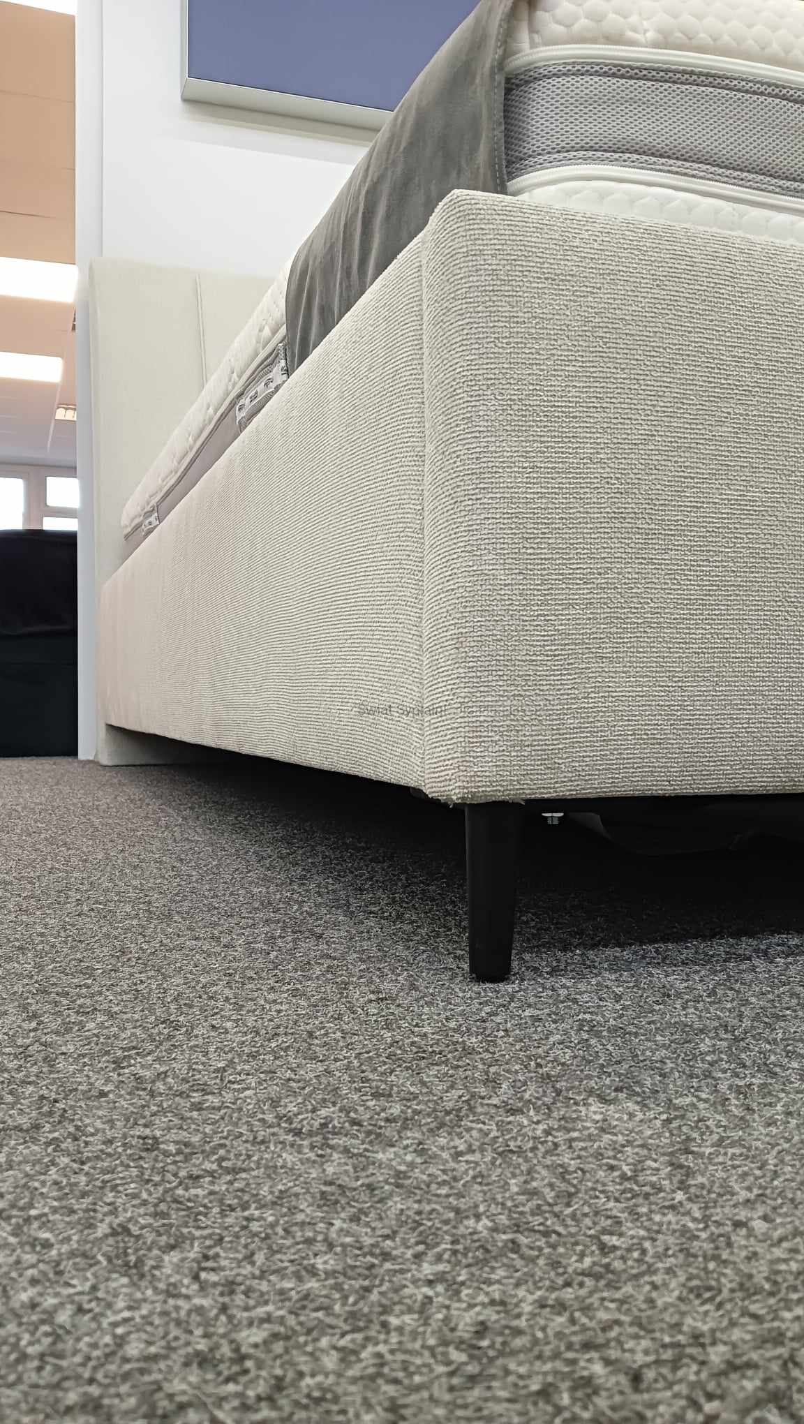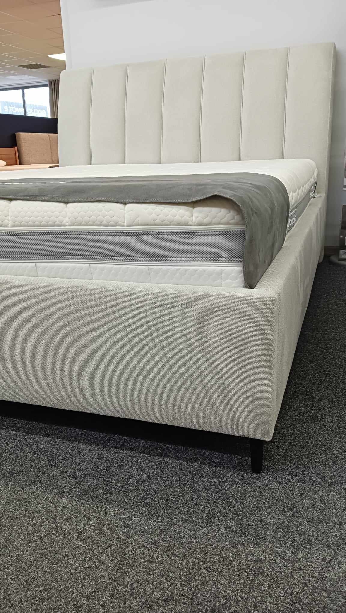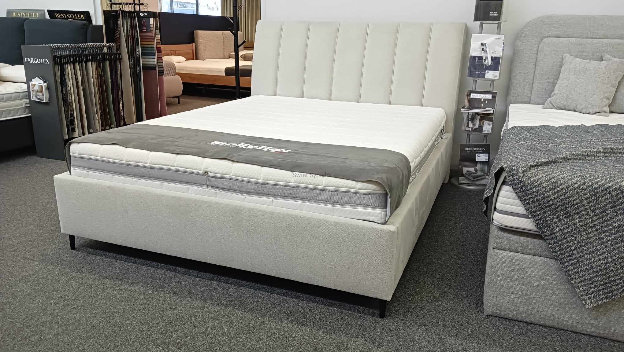 Łóżko tapicerowane z funkcjonalnym pojemnikiem na pościel, który znajduje się pod stelażem i materacem na całej wielkości łóżka. Stelaż na metalowej ramie z poprzecznymi elastycznymi listewkami jest otwierany z użyciem dwóch siłowników gazowych. Dno łóżka, płyta z okrągłymi wywietrznikami daje dodatkową cyrkulację powietrza w pojemniku gdyż jest mocowana na kątownikach w odpowiedniej wysokości od podłogi.