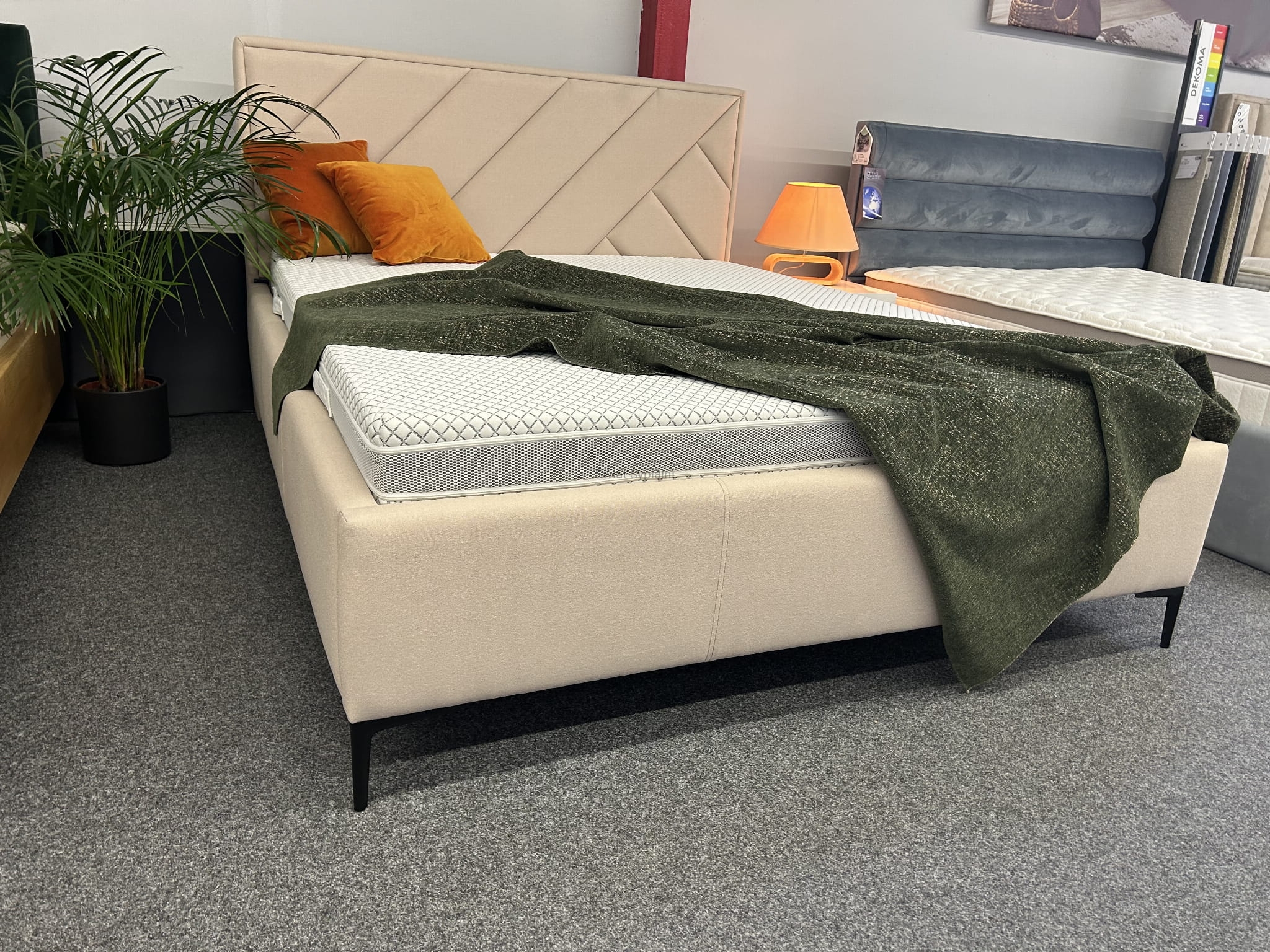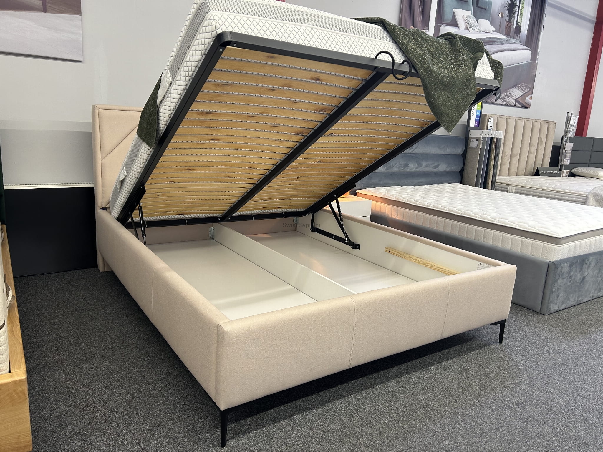 Na zdjęciu: rozmiar łóżka 160/200, wersja z pojemnikiem na pościel, obicie Hygge 2534 grupa 1, nogi (za dopatą) metalowe, czarny mat