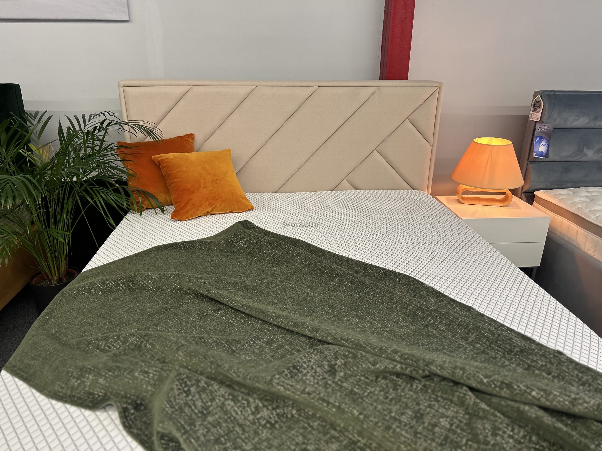 Łóżko NASTRI wyróżnia się dekoracyjnym wzorem ukośnych pasów na wezgłowiu. Łóżko dostępne jest w bogatej palecie tkanin i kolorów (dostępnych jest aż 5 grup cenowych).