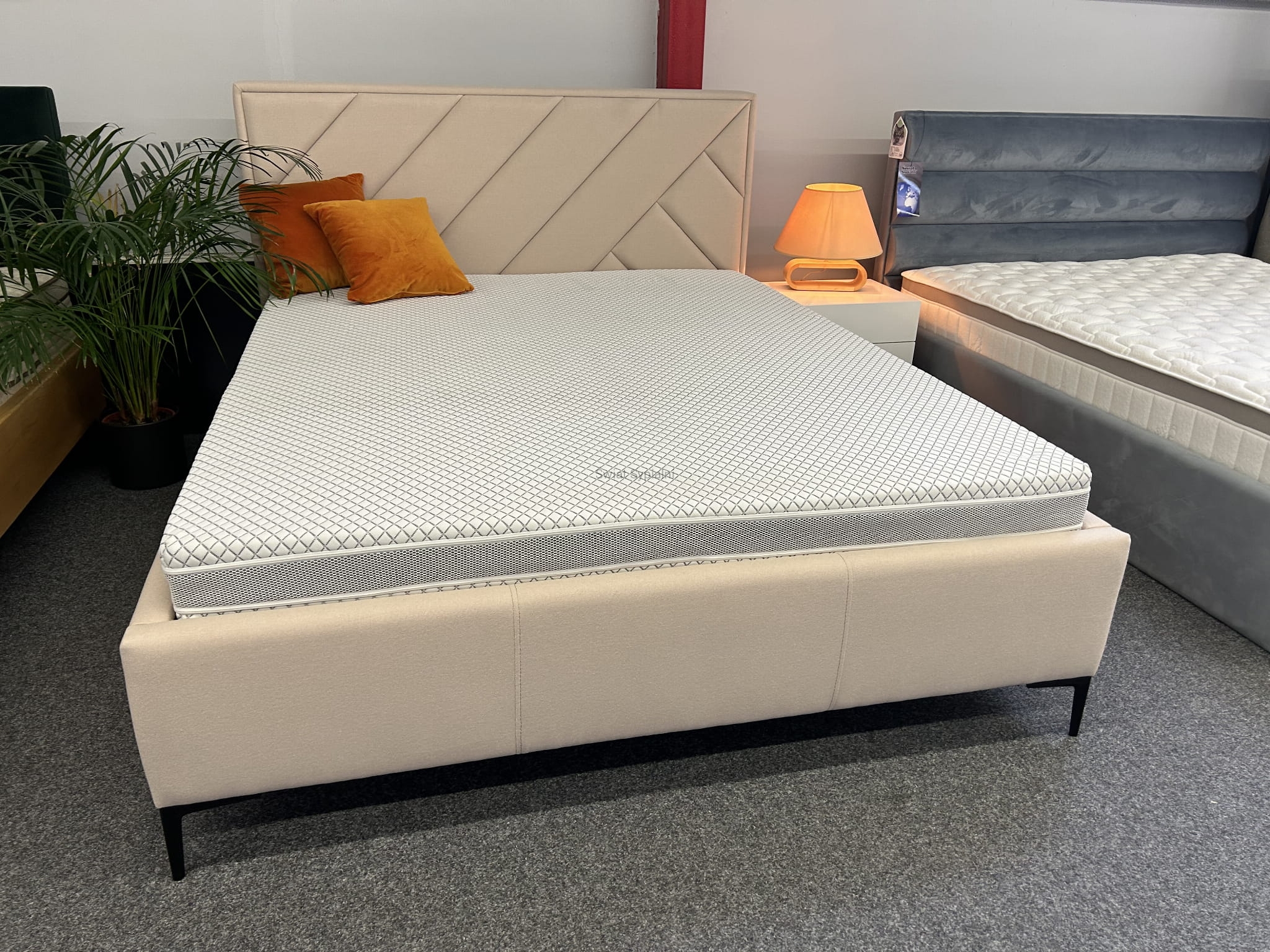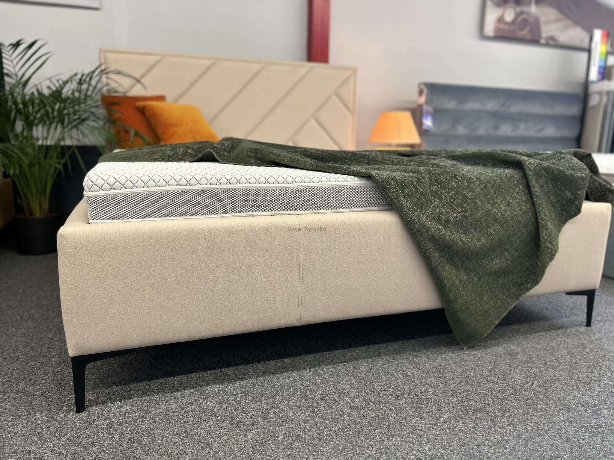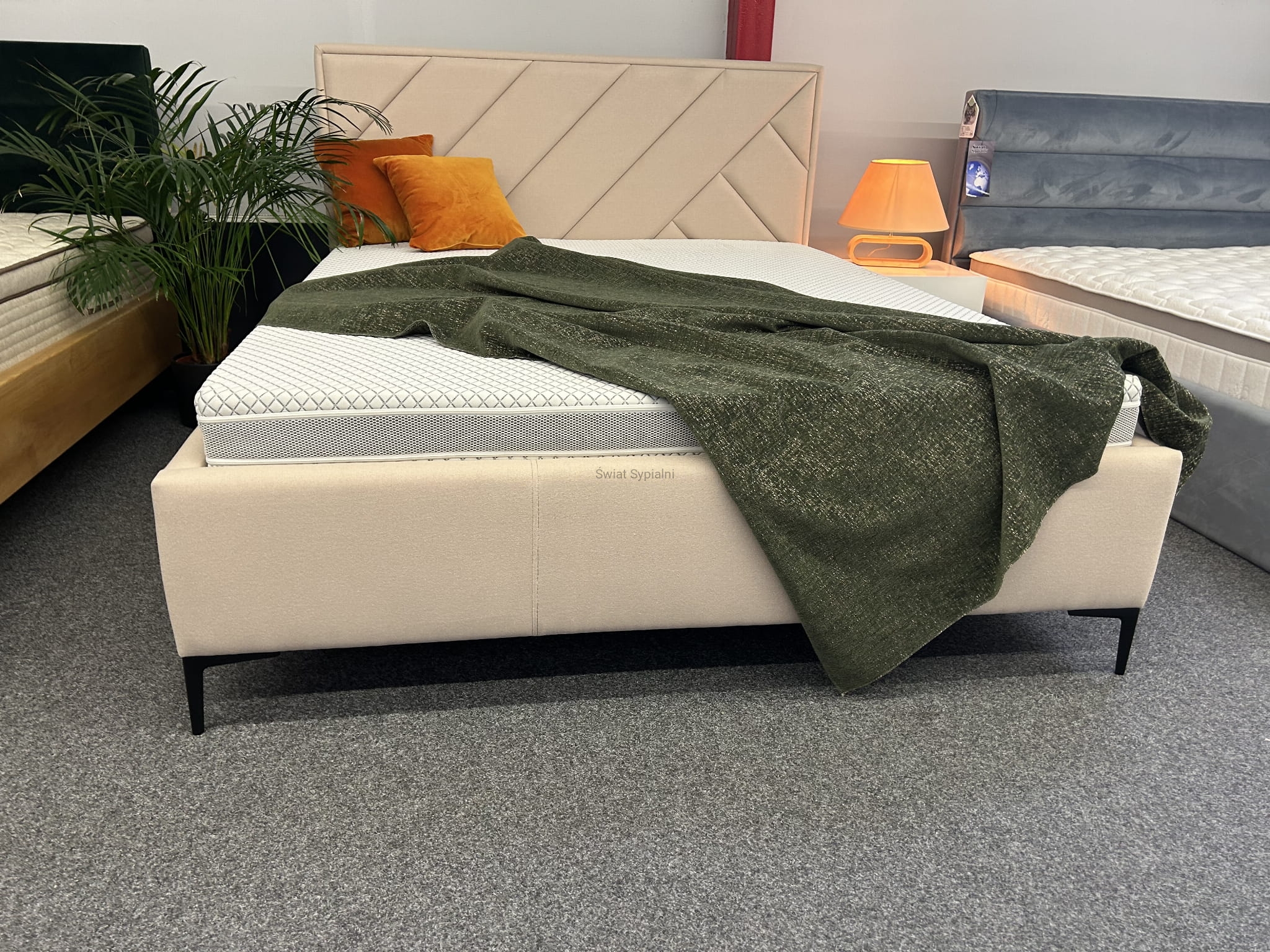 Na zdjęciu: rozmiar łóżka 160/200, wersja z pojemnikiem na pościel, obicie Hygge 2534 grupa 1, nogi metalowe czarny mat