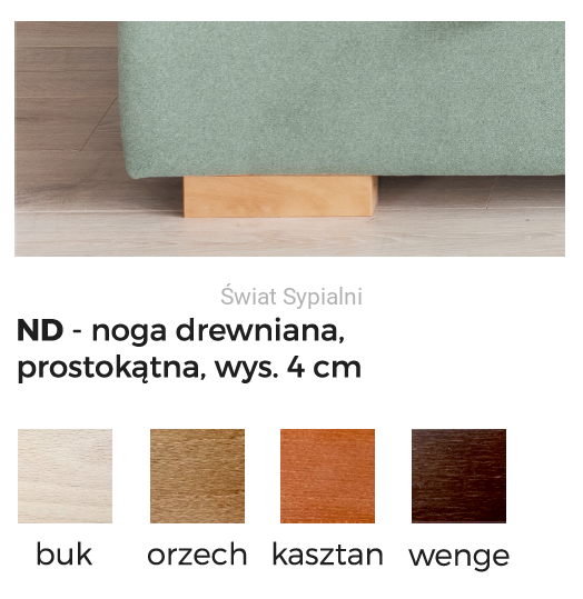 1. Nogi (symbol ND) drewniane prostokątne, wysokość 4cm (nóżki w kolorach: buk, orzech, kasztan, wenge)