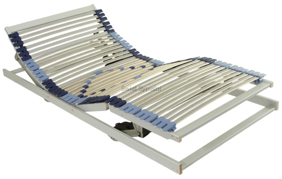Budowa: stelaż całościowo wykonany z drewna bukowego, klejonego warstwowo, pokrytego folią dekoracyjną w kolorze srebrnym. Listwy osadzone w potrójnych elastycznych uchwytach na ramie stelaża, wzmocnione pasem dla lepszego rozłożenia ciężaru ciała. Płynna regulacja elektryczna wysokości zagłówka i zanóżka. Zasilacz położony poza stelażem ( znikome pole elektromagnetyczne ) siłownik zasilany bezpiecznym napięciem stałym 24V, funkcja standby wyłączająca zasilanie po 40 sek. nieużywania. Dodatkowa regulacja twardości w części środkowej stelaża.