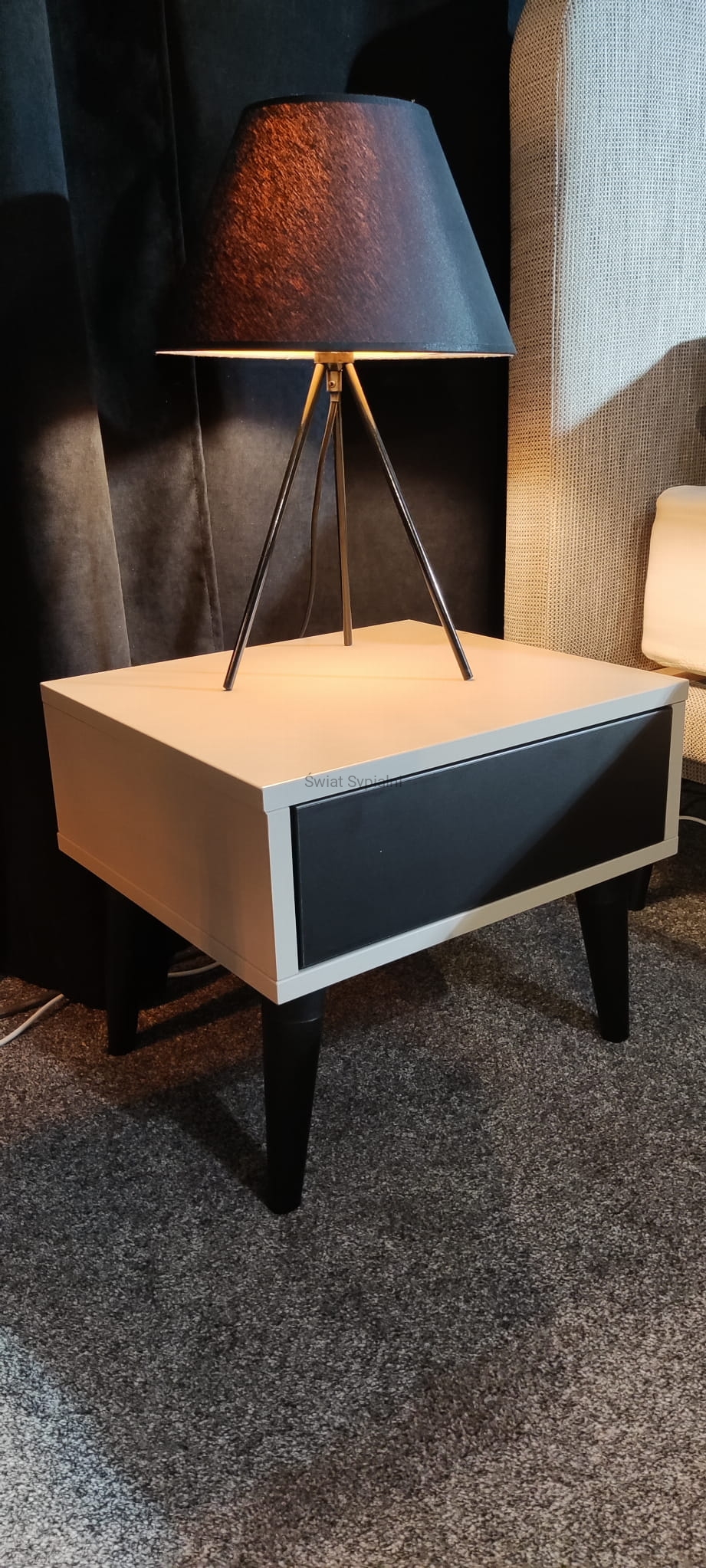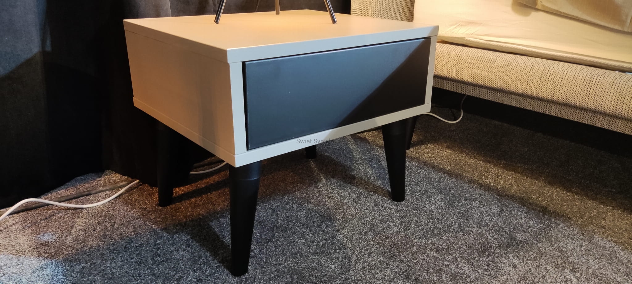 Stolik nocny wykonany z płyty meblowej (Pfleiderer). Występuje w dwóch wersjach kolorystycznych: