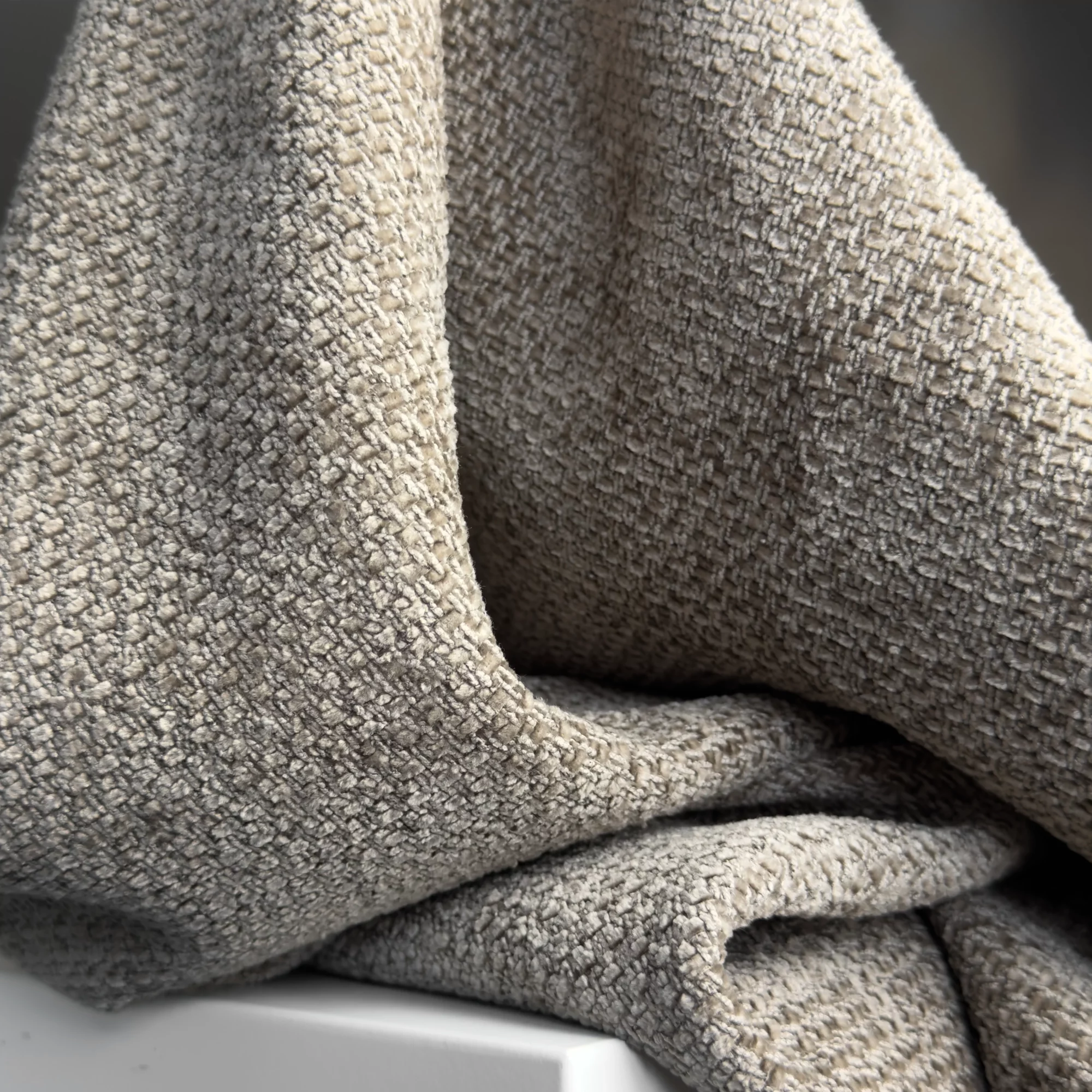 *Tkanina Angola wykonana o przędzy boucle o bardzo charakterystycznej strukturze oraz o bardzo wysokiej gramaturze. Dzięki dodatkowi wiskozy jest miękka i przyjemna w dotyku. Boucle (Bukla) to rodzaj pełnej, mięsistej wręcz dzianiny, którą charakteryzuje wyjątkowa tekstura. Jako że wykonywana jest ona z przędzy pętelkowej, powierzchnię tkaniny pokrywają gęsto i nieregularnie ułożone pętelki i supełki, jedne bardziej zwarte, inne puszyste.